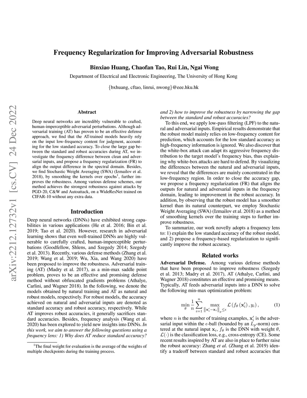 Deep neural networks are incredibly vulnerable to crafted, human-imperceptible adversarial perturbations. Although adversarial training (AT) has proven to be an effective defense approach, we find that the AT-trained models heavily rely on the input low-frequency content for judgment, accounting for the low standard accuracy. To close the large gap between the standard and robust accuracies during AT, we investigate the frequency difference between clean and adversarial inputs, and propose a frequency regularization (FR) to align the output difference in the spectral domain. Besides, we find Stochastic Weight Averaging (SWA), by smoothing the kernels over epochs, further improves the robustness. Among various defense schemes, our method achieves the strongest robustness against attacks by PGD-20, C\&W and Autoattack, on a WideResNet trained on CIFAR-10 without any extra data.