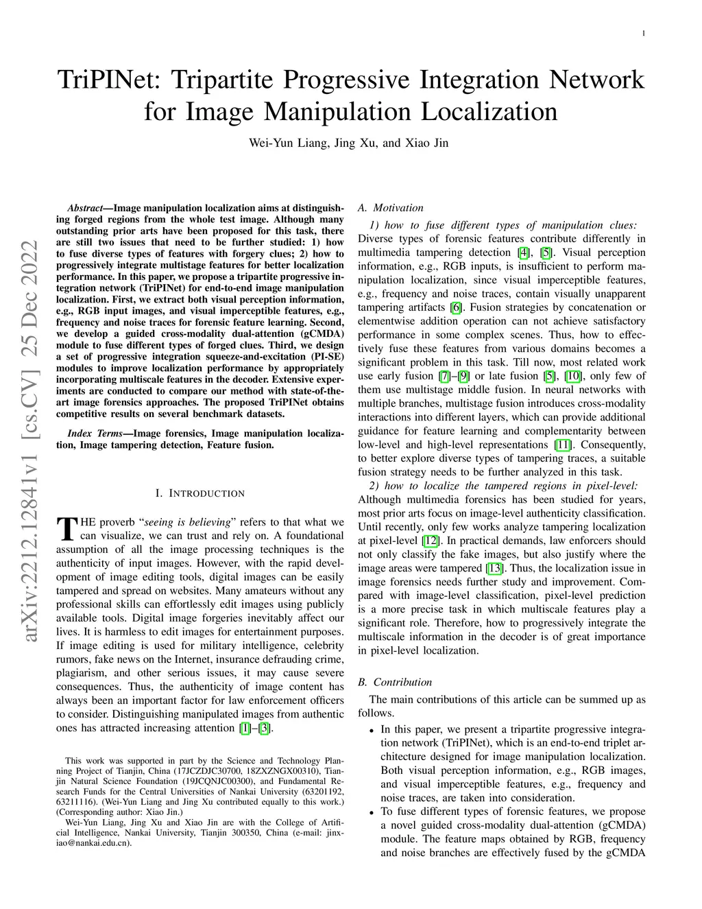Image manipulation localization aims at distinguishing forged regions from the whole test image. Although many outstanding prior arts have been proposed for this task, there are still two issues that need to be further studied: 1) how to fuse diverse types of features with forgery clues; 2) how to progressively integrate multistage features for better localization performance. In this paper, we propose a tripartite progressive integration network (TriPINet) for end-to-end image manipulation localization. First, we extract both visual perception information, e.g., RGB input images, and visual imperceptible features, e.g., frequency and noise traces for forensic feature learning. Second, we develop a guided cross-modality dual-attention (gCMDA) module to fuse different types of forged clues. Third, we design a set of progressive integration squeeze-and-excitation (PI-SE) modules to improve localization performance by appropriately incorporating multiscale features in the decoder. Extensive experiments are conducted to compare our method with state-of-the-art image forensics approaches. The proposed TriPINet obtains competitive results on several benchmark datasets.