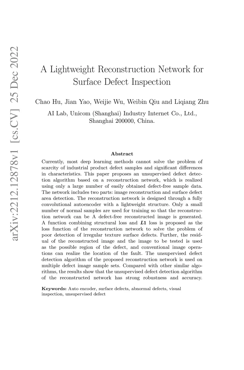 Currently, most deep learning methods cannot solve the problem of scarcity of industrial product defect samples and significant differences in characteristics. This paper proposes an unsupervised defect detection algorithm based on a reconstruction network, which is realized using only a large number of easily obtained defect-free sample data. The network includes two parts: image reconstruction and surface defect area detection. The reconstruction network is designed through a fully convolutional autoencoder with a lightweight structure. Only a small number of normal samples are used for training so that the reconstruction network can be A defect-free reconstructed image is generated. A function combining structural loss and loss is proposed as the loss function of the reconstruction network to solve the problem of poor detection of irregular texture surface defects. Further, the residual of the reconstructed image and the image to be tested is used as the possible region of the defect, and conventional image operations can realize the location of the fault. The unsupervised defect detection algorithm of the proposed reconstruction network is used on multiple defect image sample sets. Compared with other similar algorithms, the results show that the unsupervised defect detection algorithm of the reconstructed network has strong robustness and accuracy.