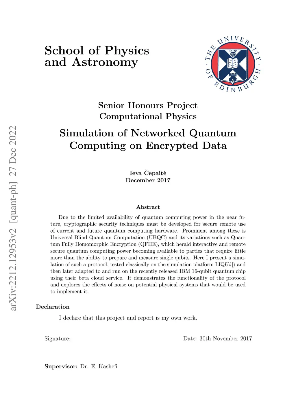 Due to the limited availability of quantum computing power in the near future, cryptographic security techniques must be developed for secure remote use of current and future quantum computing hardware. Prominent among these is Universal Blind Quantum Computation (UBQC) and its variations such as Quantum Fully Homomorphic Encryption (QFHE), which herald interactive and remote secure quantum computing power becoming available to parties that require little more than the ability to prepare and measure single qubits. Here I present a simulation of such a protocol, tested classically on the simulation platform LIQ and then later adapted to and run on the recently released IBM 16-qubit quantum chip using their beta cloud service. It demonstrates the functionality of the protocol and explores the effects of noise on potential physical systems that would be used to implement it. BSc Thesis from the University of Edinburgh, December 2017