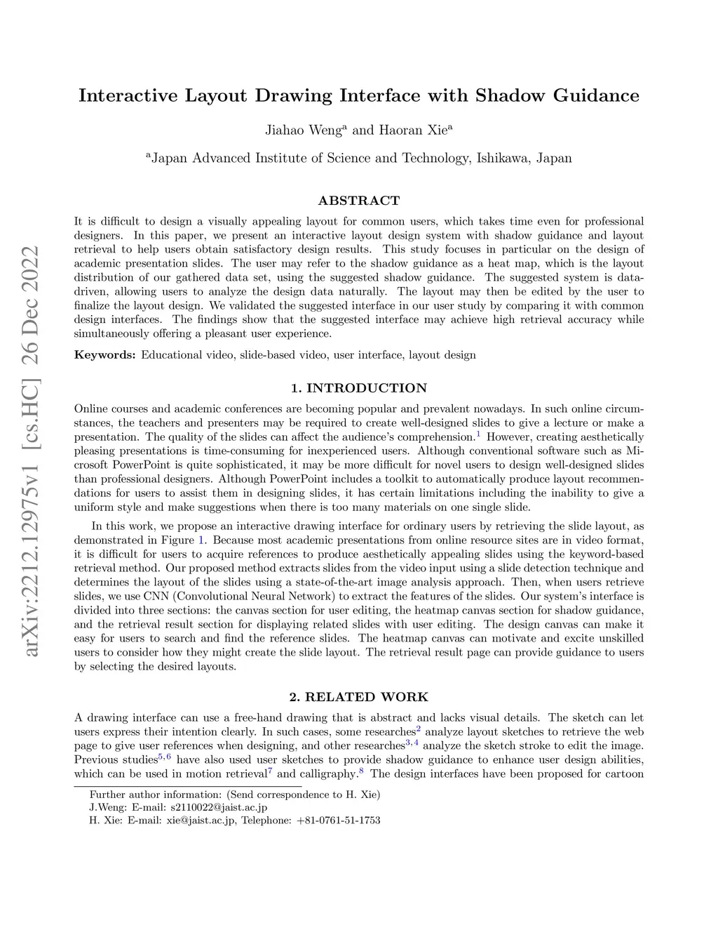It is difficult to design a visually appealing layout for common users, which takes time even for professional designers. In this paper, we present an interactive layout design system with shadow guidance and layout retrieval to help users obtain satisfactory design results. This study focuses in particular on the design of academic presentation slides. The user may refer to the shadow guidance as a heat map, which is the layout distribution of our gathered data set, using the suggested shadow guidance. The suggested system is data-driven, allowing users to analyze the design data naturally. The layout may then be edited by the user to finalize the layout design. We validated the suggested interface in our user study by comparing it with common design interfaces. The findings show that the suggested interface may achieve high retrieval accuracy while simultaneously offering a pleasant user experience.