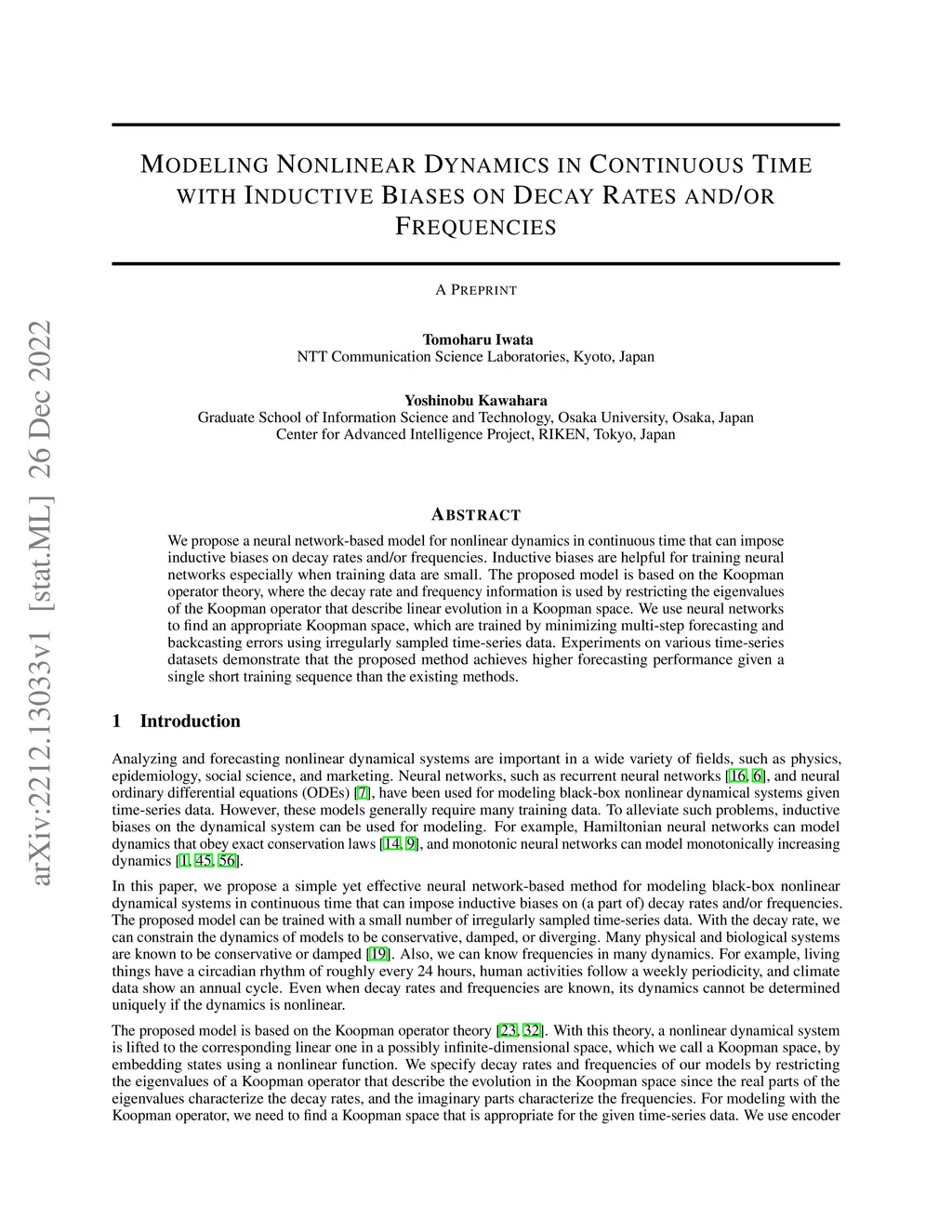 We propose a neural network-based model for nonlinear dynamics in continuous time that can impose inductive biases on decay rates and/or frequencies. Inductive biases are helpful for training neural networks especially when training data are small. The proposed model is based on the Koopman operator theory, where the decay rate and frequency information is used by restricting the eigenvalues of the Koopman operator that describe linear evolution in a Koopman space. We use neural networks to find an appropriate Koopman space, which are trained by minimizing multi-step forecasting and backcasting errors using irregularly sampled time-series data. Experiments on various time-series datasets demonstrate that the proposed method achieves higher forecasting performance given a single short training sequence than the existing methods.
