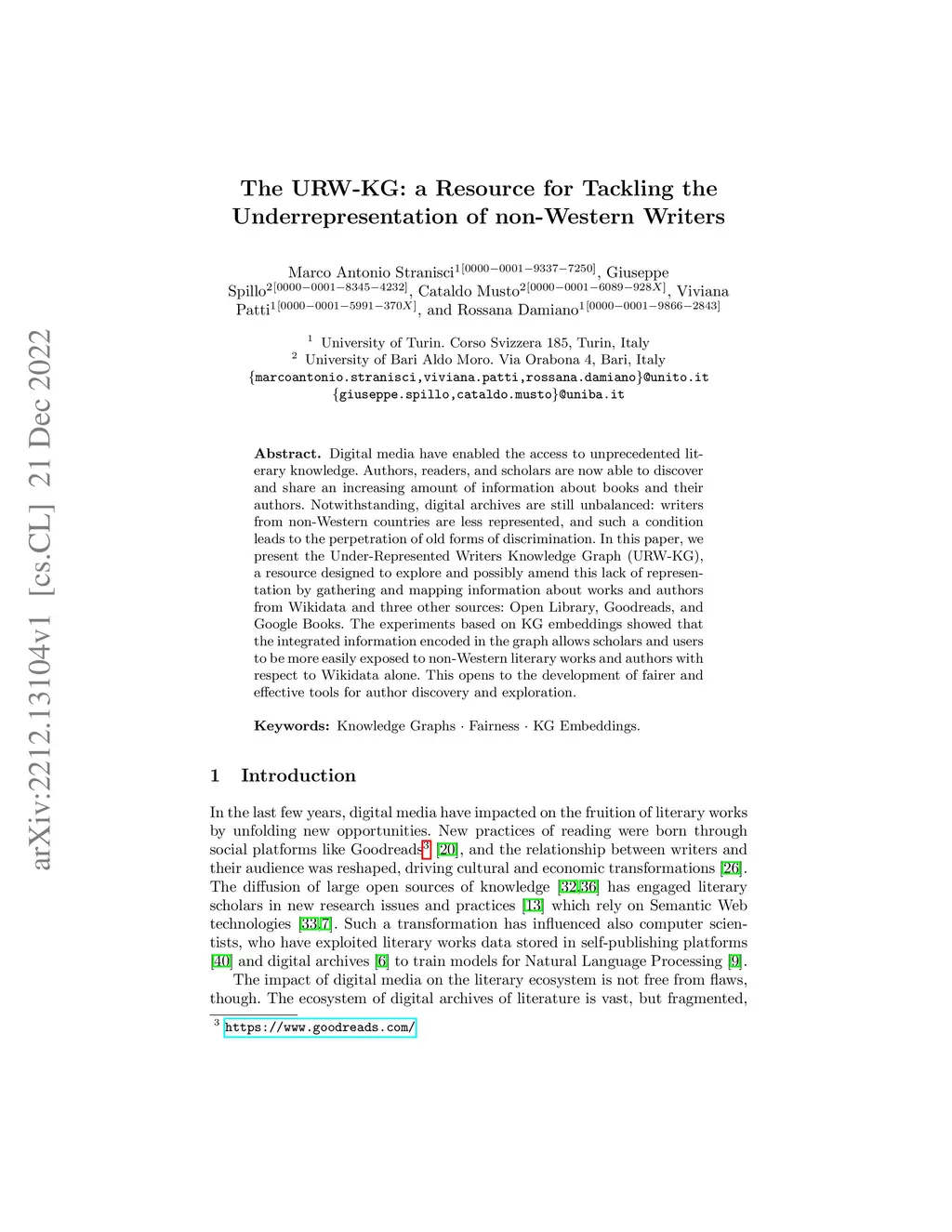 Digital media have enabled the access to unprecedented literary knowledge. Authors, readers, and scholars are now able to discover and share an increasing amount of information about books and their authors. Notwithstanding, digital archives are still unbalanced: writers from non-Western countries are less represented, and such a condition leads to the perpetration of old forms of discrimination. In this paper, we present the Under-Represented Writers Knowledge Graph (URW-KG), a resource designed to explore and possibly amend this lack of representation by gathering and mapping information about works and authors from Wikidata and three other sources: Open Library, Goodreads, and Google Books. The experiments based on KG embeddings showed that the integrated information encoded in the graph allows scholars and users to be more easily exposed to non-Western literary works and authors with respect to Wikidata alone. This opens to the development of fairer and effective tools for author discovery and exploration.