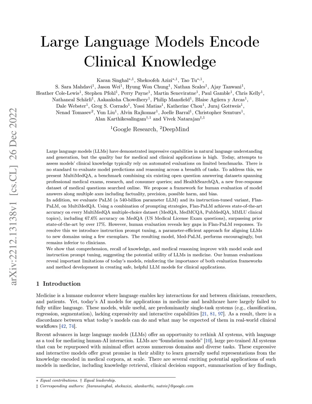 Large language models (LLMs) have demonstrated impressive capabilities in natural language understanding and generation, but the quality bar for medical and clinical applications is high. Today, attempts to assess models' clinical knowledge typically rely on automated evaluations on limited benchmarks. There is no standard to evaluate model predictions and reasoning across a breadth of tasks. To address this, we present MultiMedQA, a benchmark combining six existing open question answering datasets spanning professional medical exams, research, and consumer queries; and HealthSearchQA, a new free-response dataset of medical questions searched online. We propose a framework for human evaluation of model answers along multiple axes including factuality, precision, possible harm, and bias. In addition, we evaluate PaLM (a 540-billion parameter LLM) and its instruction-tuned variant, Flan-PaLM, on MultiMedQA. Using a combination of prompting strategies, Flan-PaLM achieves state-of-the-art accuracy on every MultiMedQA multiple-choice dataset (MedQA, MedMCQA, PubMedQA, MMLU clinical topics), including 67.6% accuracy on MedQA (US Medical License Exam questions), surpassing prior state-of-the-art by over 17%. However, human evaluation reveals key gaps in Flan-PaLM responses. To resolve this we introduce instruction prompt tuning, a parameter-efficient approach for aligning LLMs to new domains using a few exemplars. The resulting model, Med-PaLM, performs encouragingly, but remains inferior to clinicians. We show that comprehension, recall of knowledge, and medical reasoning improve with model scale and instruction prompt tuning, suggesting the potential utility of LLMs in medicine. Our human evaluations reveal important limitations of today's models, reinforcing the importance of both evaluation frameworks and method development in creating safe, helpful LLM models for clinical applications.