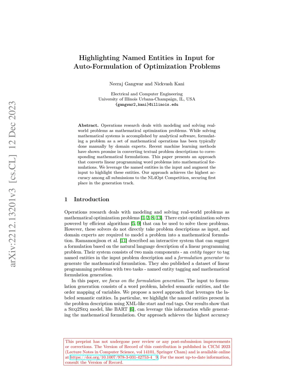 Operations research deals with modeling and solving real-world problems as mathematical optimization problems. While solving mathematical systems is accomplished by analytical software, formulating a problem as a set of mathematical operations has been typically done manually by domain experts. Recent machine learning methods have shown promise in converting textual problem descriptions to corresponding mathematical formulations. This paper presents an approach that converts linear programming word problems into mathematical formulations. We leverage the named entities in the input and augment the input to highlight these entities. Our approach achieves the highest accuracy among all submissions to the NL4Opt Competition, securing first place in the generation track.