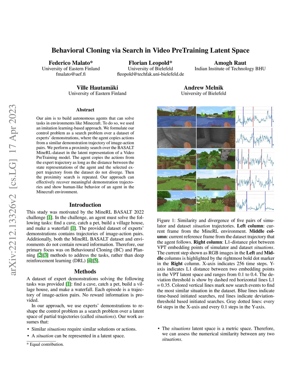 Our aim is to build autonomous agents that can solve tasks in environments like Minecraft. To do so, we used an imitation learning-based approach. We formulate our control problem as a search problem over a dataset of experts' demonstrations, where the agent copies actions from a similar demonstration trajectory of image-action pairs. We perform a proximity search over the BASALT MineRL-dataset in the latent representation of a Video PreTraining model. The agent copies the actions from the expert trajectory as long as the distance between the state representations of the agent and the selected expert trajectory from the dataset do not diverge. Then the proximity search is repeated. Our approach can effectively recover meaningful demonstration trajectories and show human-like behavior of an agent in the Minecraft environment.