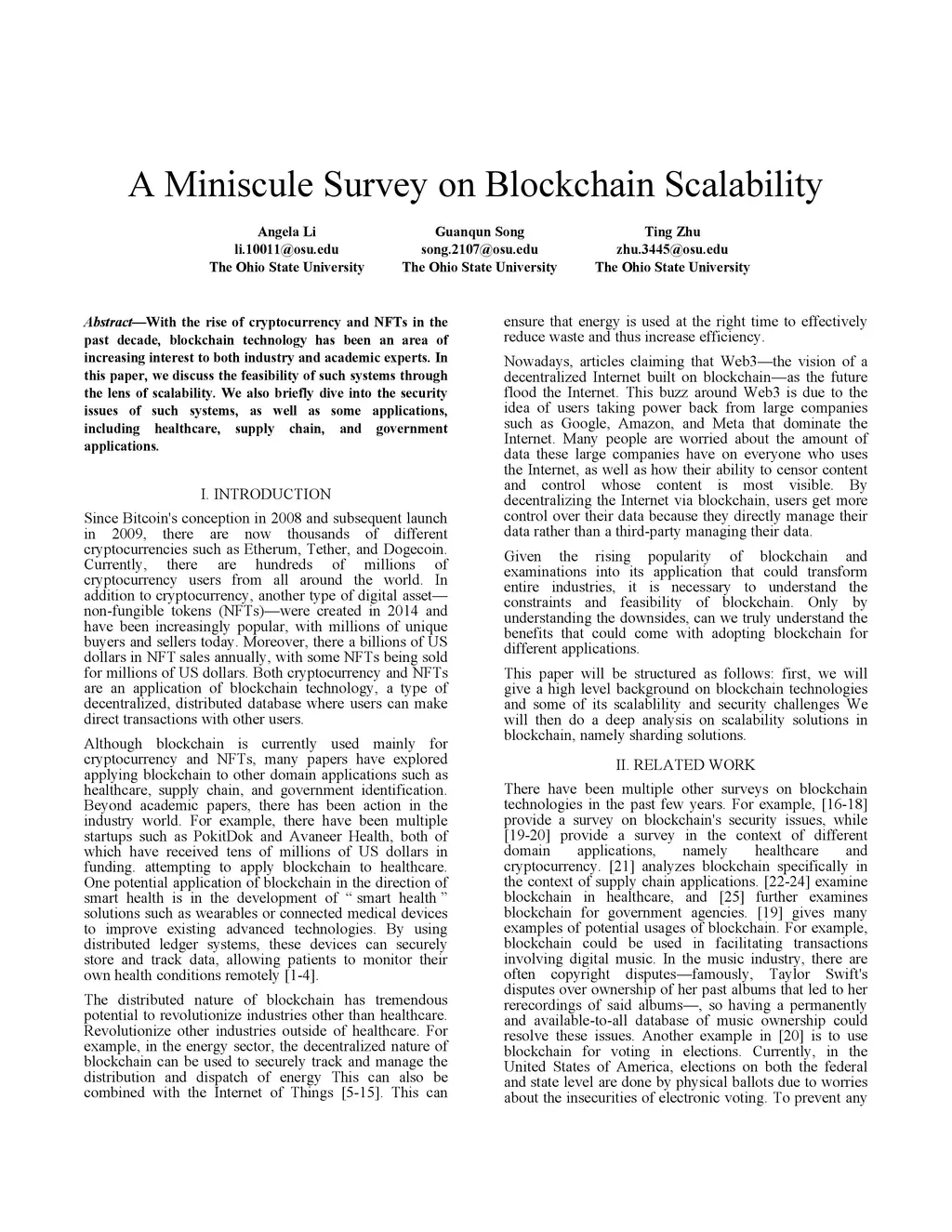 With the rise of cryptocurrency and NFTs in the past decade, blockchain technology has been an area of increasing interest to both industry and academic experts. In this paper, we discuss the feasibility of such systems through the lens of scalability. We also briefly dive into the security issues of such systems, as well as some applications, including healthcare, supply chain, and government applications.