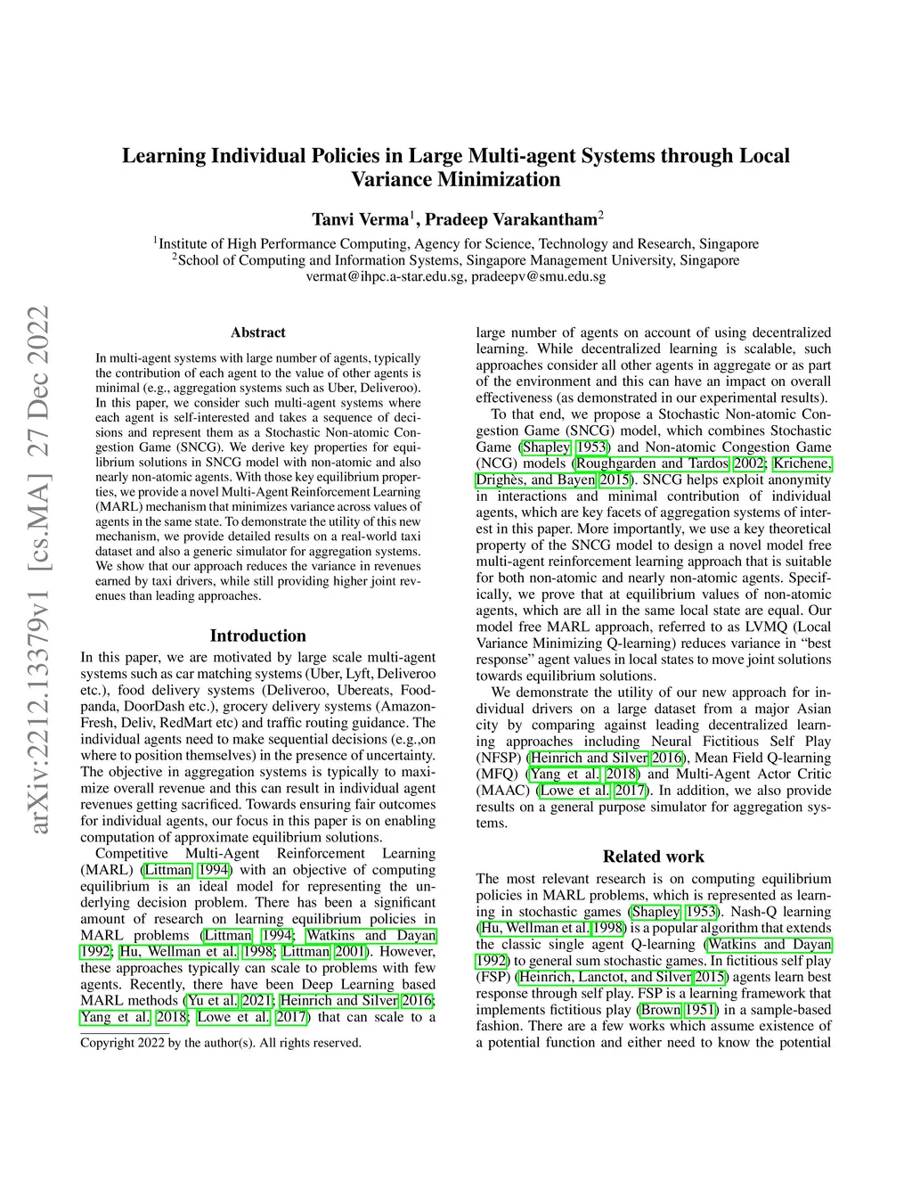 In multi-agent systems with large number of agents, typically the contribution of each agent to the value of other agents is minimal (e.g., aggregation systems such as Uber, Deliveroo). In this paper, we consider such multi-agent systems where each agent is self-interested and takes a sequence of decisions and represent them as a Stochastic Non-atomic Congestion Game (SNCG). We derive key properties for equilibrium solutions in SNCG model with non-atomic and also nearly non-atomic agents. With those key equilibrium properties, we provide a novel Multi-Agent Reinforcement Learning (MARL) mechanism that minimizes variance across values of agents in the same state. To demonstrate the utility of this new mechanism, we provide detailed results on a real-world taxi dataset and also a generic simulator for aggregation systems. We show that our approach reduces the variance in revenues earned by taxi drivers, while still providing higher joint revenues than leading approaches.