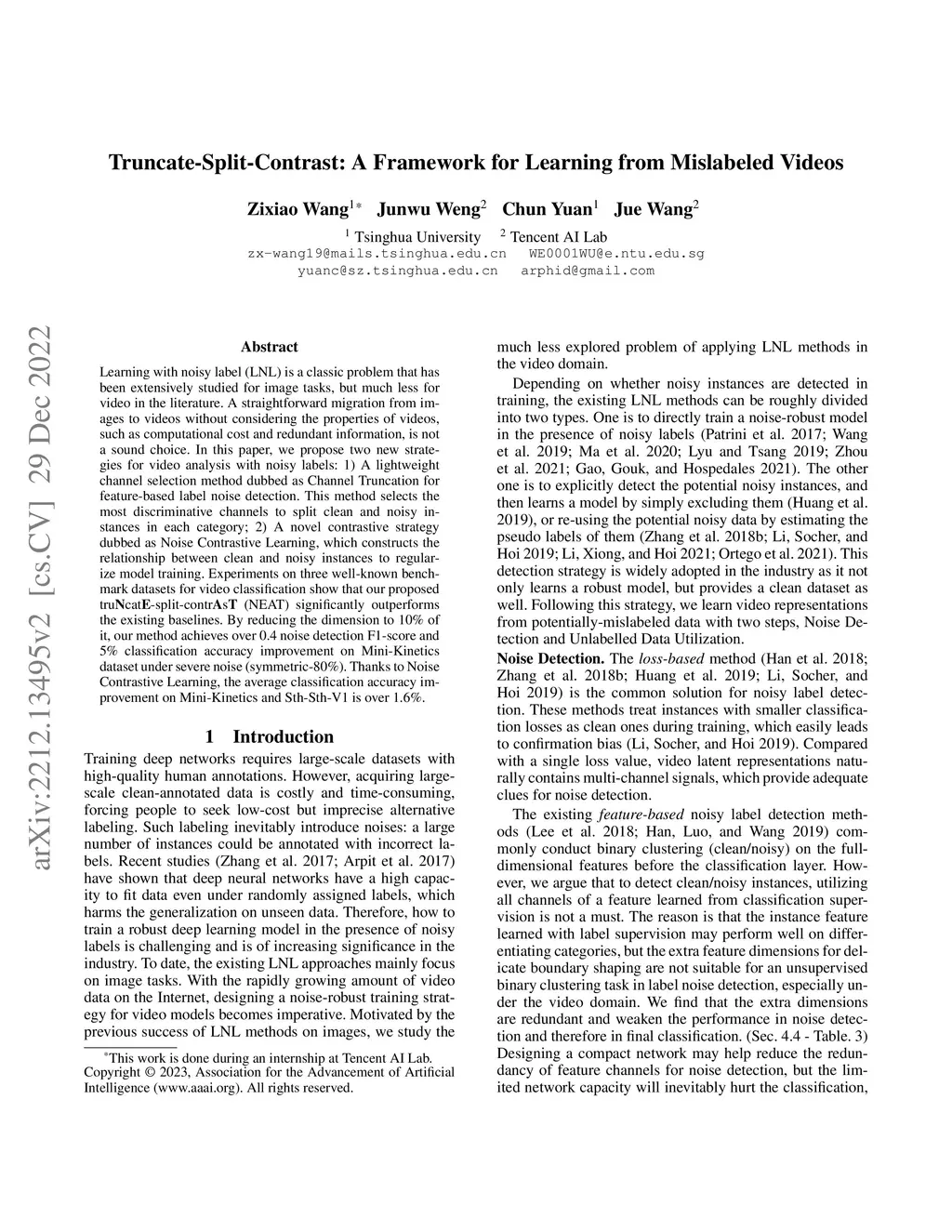 Learning with noisy label (LNL) is a classic problem that has been extensively studied for image tasks, but much less for video in the literature. A straightforward migration from images to videos without considering the properties of videos, such as computational cost and redundant information, is not a sound choice. In this paper, we propose two new strategies for video analysis with noisy labels: 1) A lightweight channel selection method dubbed as Channel Truncation for feature-based label noise detection. This method selects the most discriminative channels to split clean and noisy instances in each category; 2) A novel contrastive strategy dubbed as Noise Contrastive Learning, which constructs the relationship between clean and noisy instances to regularize model training. Experiments on three well-known benchmark datasets for video classification show that our proposed tru{\bf N}cat{\bf E}-split-contr{\bf A}s{\bf T} (NEAT) significantly outperforms the existing baselines. By reducing the dimension to 10\% of it, our method achieves over 0.4 noise detection F1-score and 5\% classification accuracy improvement on Mini-Kinetics dataset under severe noise (symmetric-80\%). Thanks to Noise Contrastive Learning, the average classification accuracy improvement on Mini-Kinetics and Sth-Sth-V1 is over 1.6\%.