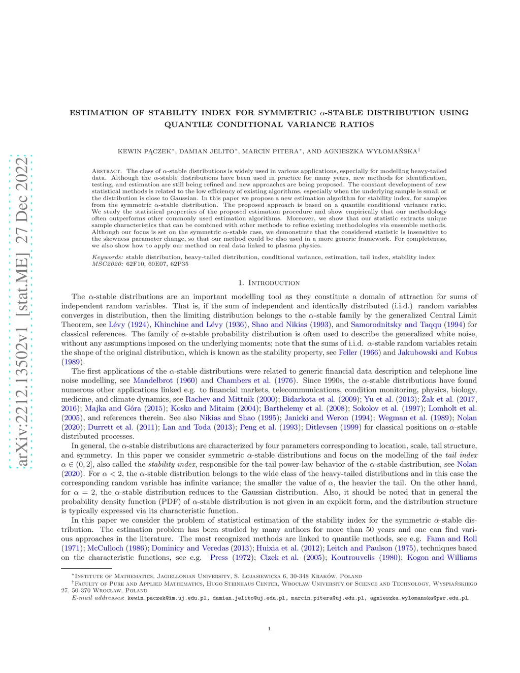 The class of -stable distributions is widely used in various applications, especially for modelling heavy-tailed data. Although the -stable distributions have been used in practice for many years, new methods for identification, testing, and estimation are still being refined and new approaches are being proposed. The constant development of new statistical methods is related to the low efficiency of existing algorithms, especially when the underlying sample is small or the underlying distribution is close to Gaussian. In this paper we propose a new estimation algorithm for stability index, for samples from the symmetric -stable distribution. The proposed approach is based on quantile conditional variance ratio. We study the statistical properties of the proposed estimation procedure and show empirically that our methodology often outperforms other commonly used estimation algorithms. Moreover, we show that our statistic extracts unique sample characteristics that can be combined with other methods to refine existing methodologies via ensamble methods. Although our focus is set on the symmetric -stable case, we demonstrate that the considered statistic is insensitive to the skewness parameter change, so that our method could be also used in a more generic framework. For completeness, we also show how to apply our method on real data linked to plasma physics.
