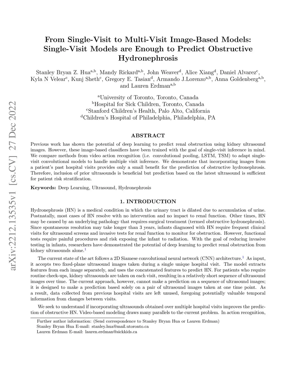 Previous work has shown the potential of deep learning to predict renal obstruction using kidney ultrasound images. However, these image-based classifiers have been trained with the goal of single-visit inference in mind. We compare methods from video action recognition (i.e. convolutional pooling, LSTM, TSM) to adapt single-visit convolutional models to handle multiple visit inference. We demonstrate that incorporating images from a patient's past hospital visits provides only a small benefit for the prediction of obstructive hydronephrosis. Therefore, inclusion of prior ultrasounds is beneficial, but prediction based on the latest ultrasound is sufficient for patient risk stratification.