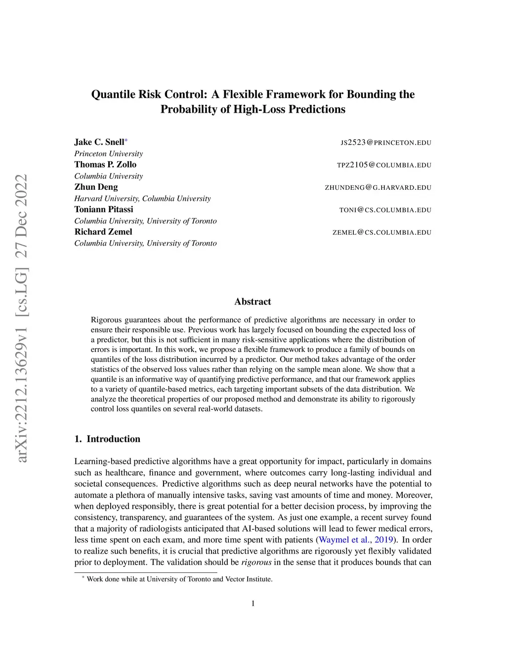 Rigorous guarantees about the performance of predictive algorithms are necessary in order to ensure their responsible use. Previous work has largely focused on bounding the expected loss of a predictor, but this is not sufficient in many risk-sensitive applications where the distribution of errors is important. In this work, we propose a flexible framework to produce a family of bounds on quantiles of the loss distribution incurred by a predictor. Our method takes advantage of the order statistics of the observed loss values rather than relying on the sample mean alone. We show that a quantile is an informative way of quantifying predictive performance, and that our framework applies to a variety of quantile-based metrics, each targeting important subsets of the data distribution. We analyze the theoretical properties of our proposed method and demonstrate its ability to rigorously control loss quantiles on several real-world datasets.