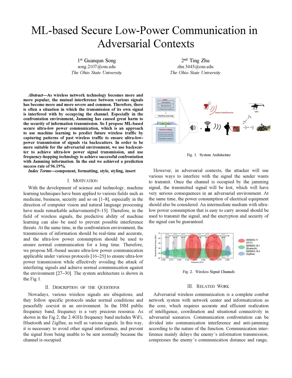 As wireless network technology becomes more and more popular, mutual interference between various signals has become more and more severe and common. Therefore, there is often a situation in which the transmission of its own signal is interfered with by occupying the channel. Especially in a confrontational environment, Jamming has caused great harm to the security of information transmission. So I propose ML-based secure ultra-low power communication, which is an approach to use machine learning to predict future wireless traffic by capturing patterns of past wireless traffic to ensure ultra-low-power transmission of signals via backscatters. In order to be more suitable for the adversarial environment, we use backscatter to achieve ultra-low power signal transmission, and use frequency-hopping technology to achieve successful confrontation with Jamming information. In the end, we achieved a prediction success rate of 96.19%.