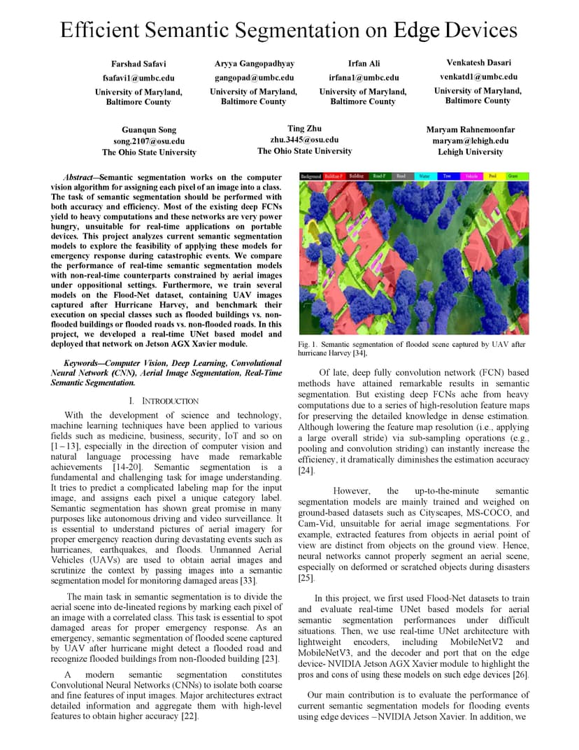 Semantic segmentation works on the computer vision algorithm for assigning each pixel of an image into a class. The task of semantic segmentation should be performed with both accuracy and efficiency. Most of the existing deep FCNs yield to heavy computations and these networks are very power hungry, unsuitable for real-time applications on portable devices. This project analyzes current semantic segmentation models to explore the feasibility of applying these models for emergency response during catastrophic events. We compare the performance of real-time semantic segmentation models with non-real-time counterparts constrained by aerial images under oppositional settings. Furthermore, we train several models on the Flood-Net dataset, containing UAV images captured after Hurricane Harvey, and benchmark their execution on special classes such as flooded buildings vs. non-flooded buildings or flooded roads vs. non-flooded roads. In this project, we developed a real-time UNet based model and deployed that network on Jetson AGX Xavier module.