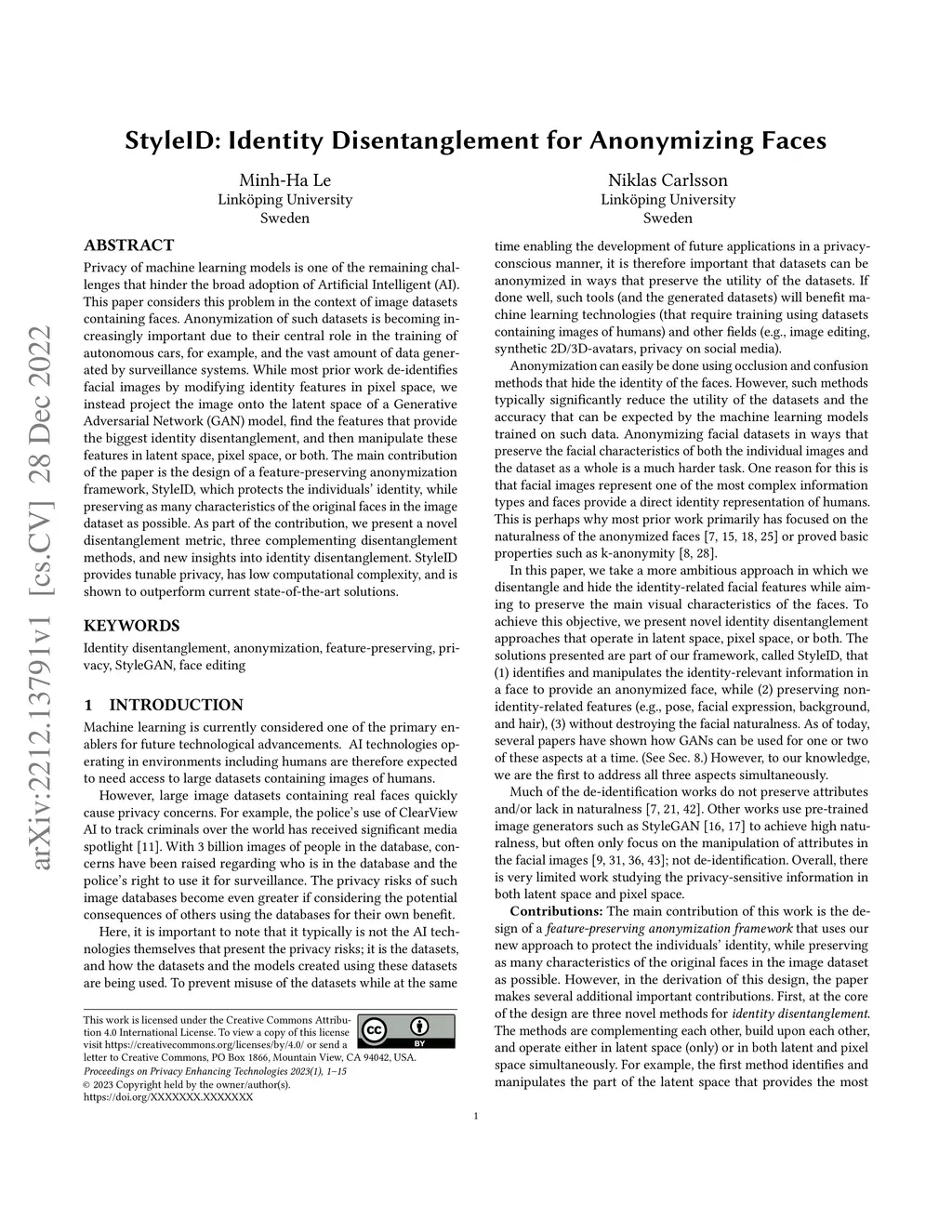 Privacy of machine learning models is one of the remaining challenges that hinder the broad adoption of Artificial Intelligent (AI). This paper considers this problem in the context of image datasets containing faces. Anonymization of such datasets is becoming increasingly important due to their central role in the training of autonomous cars, for example, and the vast amount of data generated by surveillance systems. While most prior work de-identifies facial images by modifying identity features in pixel space, we instead project the image onto the latent space of a Generative Adversarial Network (GAN) model, find the features that provide the biggest identity disentanglement, and then manipulate these features in latent space, pixel space, or both. The main contribution of the paper is the design of a feature-preserving anonymization framework, StyleID, which protects the individuals' identity, while preserving as many characteristics of the original faces in the image dataset as possible. As part of the contribution, we present a novel disentanglement metric, three complementing disentanglement methods, and new insights into identity disentanglement. StyleID provides tunable privacy, has low computational complexity, and is shown to outperform current state-of-the-art solutions.