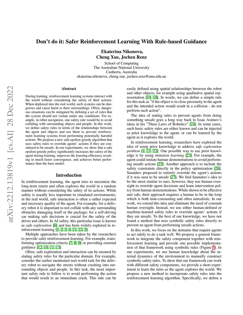 During training, reinforcement learning systems interact with the world without considering the safety of their actions. When deployed into the real world, such systems can be dangerous and cause harm to their surroundings. Often, dangerous situations can be mitigated by defining a set of rules that the system should not violate under any conditions. For example, in robot navigation, one safety rule would be to avoid colliding with surrounding objects and people. In this work, we define safety rules in terms of the relationships between the agent and objects and use them to prevent reinforcement learning systems from performing potentially harmful actions. We propose a new safe epsilon-greedy algorithm that uses safety rules to override agents' actions if they are considered to be unsafe. In our experiments, we show that a safe epsilon-greedy policy significantly increases the safety of the agent during training, improves the learning efficiency resulting in much faster convergence, and achieves better performance than the base model.