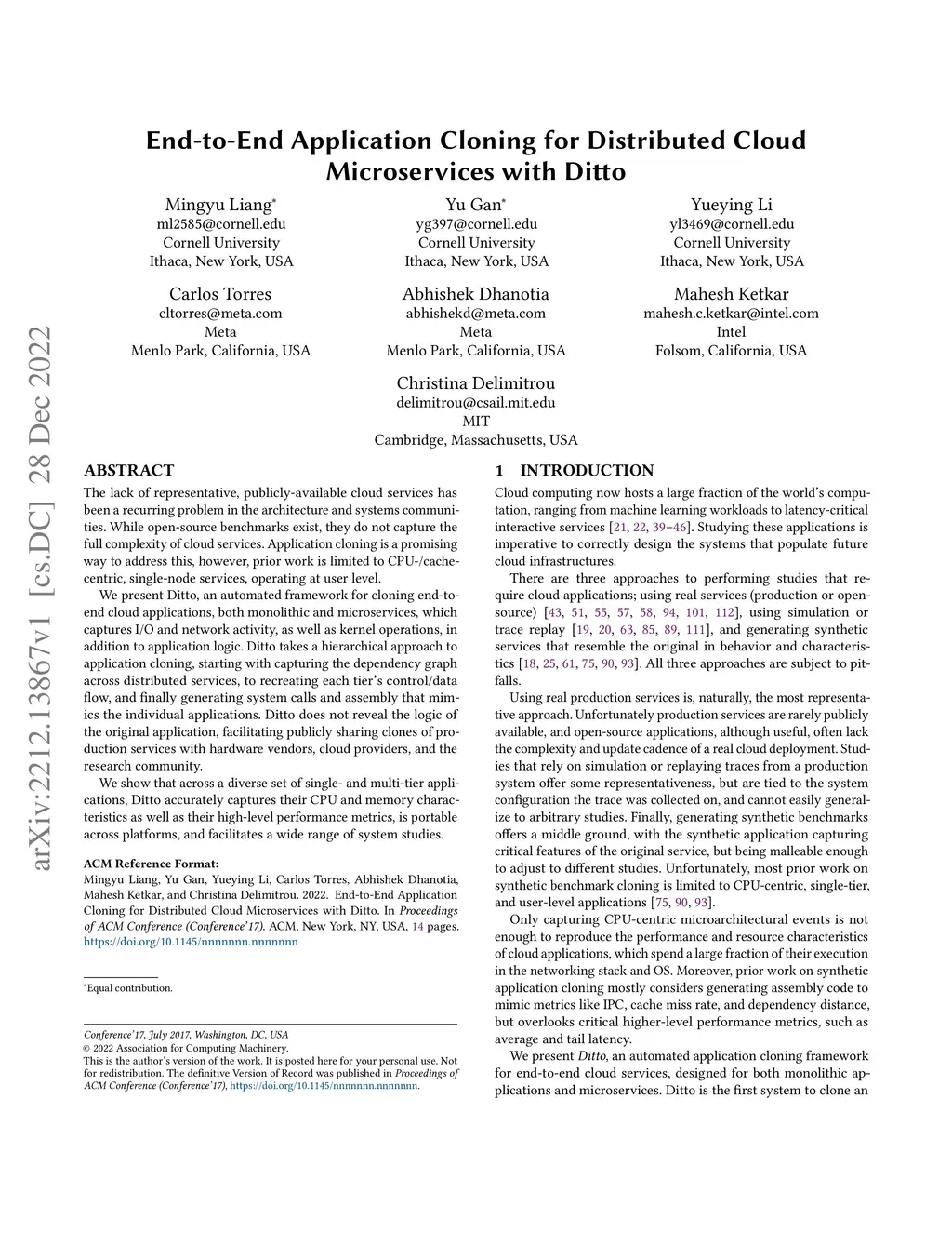 We present Ditto, an automated framework for cloning end-to-end cloud applications, both monolithic and microservices, which captures I/O and network activity, as well as kernel operations, in addition to application logic. Ditto takes a hierarchical approach to application cloning, starting with capturing the dependency graph across distributed services, to recreating each tier's control/data flow, and finally generating system calls and assembly that mimics the individual applications. Ditto does not reveal the logic of the original application, facilitating publicly sharing clones of production services with hardware vendors, cloud providers, and the research community. We show that across a diverse set of single- and multi-tier applications, Ditto accurately captures their CPU and memory characteristics as well as their high-level performance metrics, is portable across platforms, and facilitates a wide range of system studies.