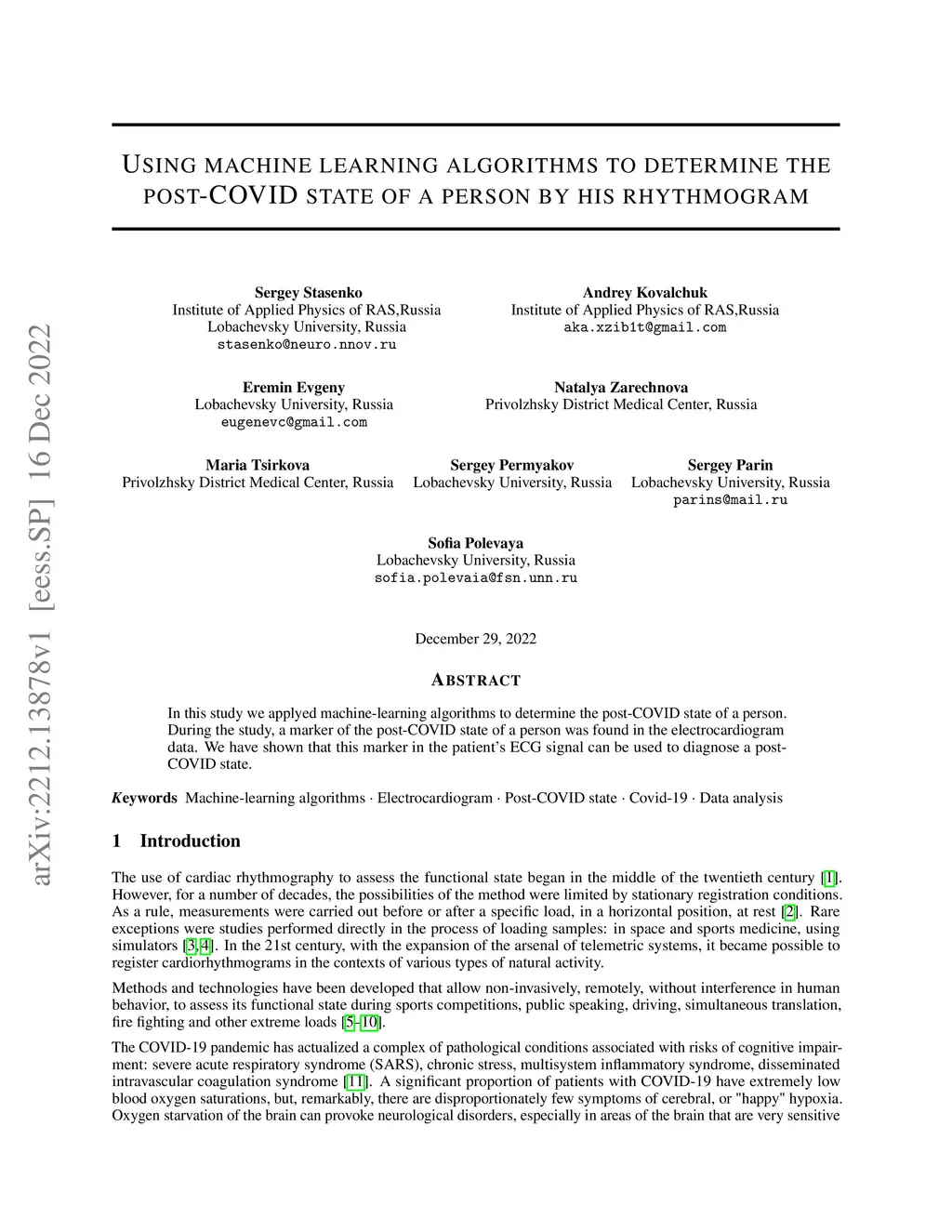 In this study we applyed machine-learning algorithms to determine the post-COVID state of a person. During the study, a marker of the post-COVID state of a person was found in the electrocardiogram data. We have shown that this marker in the patient's ECG signal can be used to diagnose a post-COVID state.