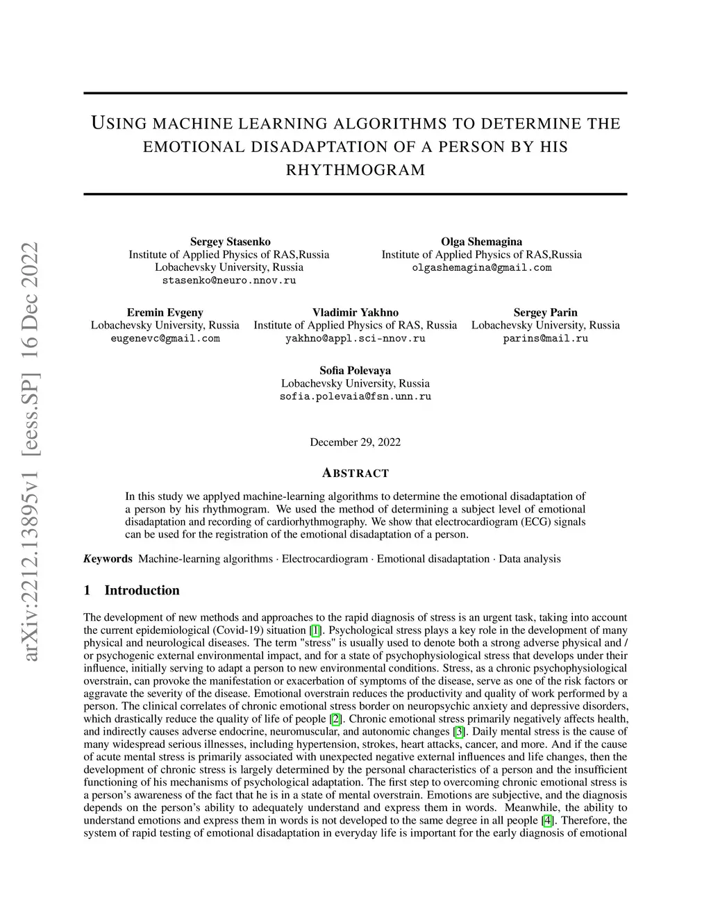 In this study we applyed machine-learning algorithms to determine the emotional disadaptation of a person by his rhythmogram. We used the method of determining a subject level of emotional disadaptation and recording of cardiorhythmography. We show that electrocardiogram (ECG) signals can be used for the registration of the emotional disadaptation of a person.
