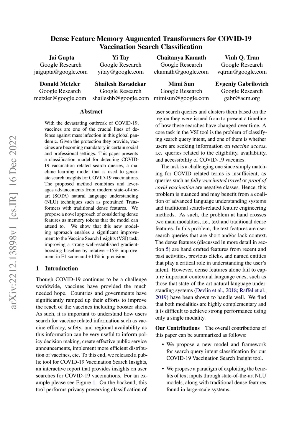 With the devastating outbreak of COVID-19, vaccines are one of the crucial lines of defense against mass infection in this global pandemic. Given the protection they provide, vaccines are becoming mandatory in certain social and professional settings. This paper presents a classification model for detecting COVID-19 vaccination related search queries, a machine learning model that is used to generate search insights for COVID-19 vaccinations. The proposed method combines and leverages advancements from modern state-of-the-art (SOTA) natural language understanding (NLU) techniques such as pretrained Transformers with traditional dense features. We propose a novel approach of considering dense features as memory tokens that the model can attend to. We show that this new modeling approach enables a significant improvement to the Vaccine Search Insights (VSI) task, improving a strong well-established gradient-boosting baseline by relative +15% improvement in F1 score and +14% in precision.