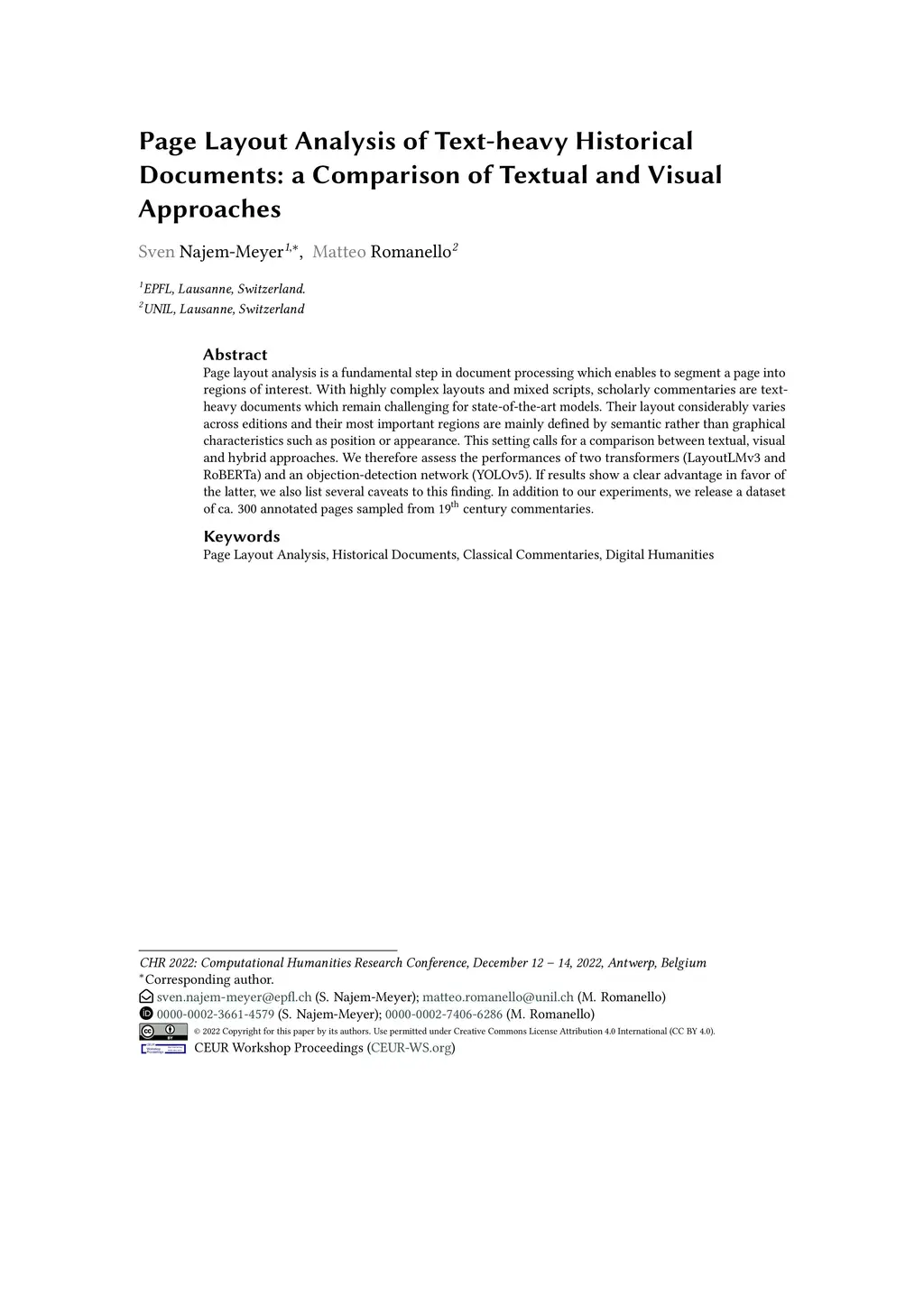 Page layout analysis is a fundamental step in document processing which enables to segment a page into regions of interest. With highly complex layouts and mixed scripts, scholarly commentaries are text-heavy documents which remain challenging for state-of-the-art models. Their layout considerably varies across editions and their most important regions are mainly defined by semantic rather than graphical characteristics such as position or appearance. This setting calls for a comparison between textual, visual and hybrid approaches. We therefore assess the performances of two transformers (LayoutLMv3 and RoBERTa) and an objection-detection network (YOLOv5). If results show a clear advantage in favor of the latter, we also list several caveats to this finding. In addition to our experiments, we release a dataset of ca. 300 annotated pages sampled from 19th century commentaries.