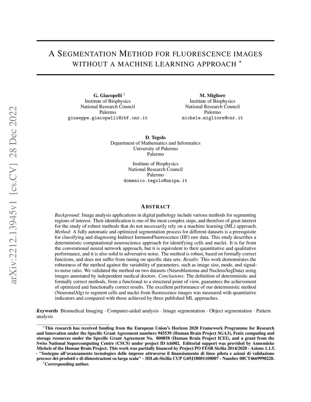 Background: Image analysis applications in digital pathology include various methods for segmenting regions of interest. Their identification is one of the most complex steps, and therefore of great interest for the study of robust methods that do not necessarily rely on a machine learning (ML) approach. Method: A fully automatic and optimized segmentation process for different datasets is a prerequisite for classifying and diagnosing Indirect ImmunoFluorescence (IIF) raw data. This study describes a deterministic computational neuroscience approach for identifying cells and nuclei. It is far from the conventional neural network approach, but it is equivalent to their quantitative and qualitative performance, and it is also solid to adversative noise. The method is robust, based on formally correct functions, and does not suffer from tuning on specific data sets. Results: This work demonstrates the robustness of the method against the variability of parameters, such as image size, mode, and signal-to-noise ratio. We validated the method on two datasets (Neuroblastoma and NucleusSegData) using images annotated by independent medical doctors. Conclusions: The definition of deterministic and formally correct methods, from a functional to a structural point of view, guarantees the achievement of optimized and functionally correct results. The excellent performance of our deterministic method (NeuronalAlg) to segment cells and nuclei from fluorescence images was measured with quantitative indicators and compared with those achieved by three published ML approaches.