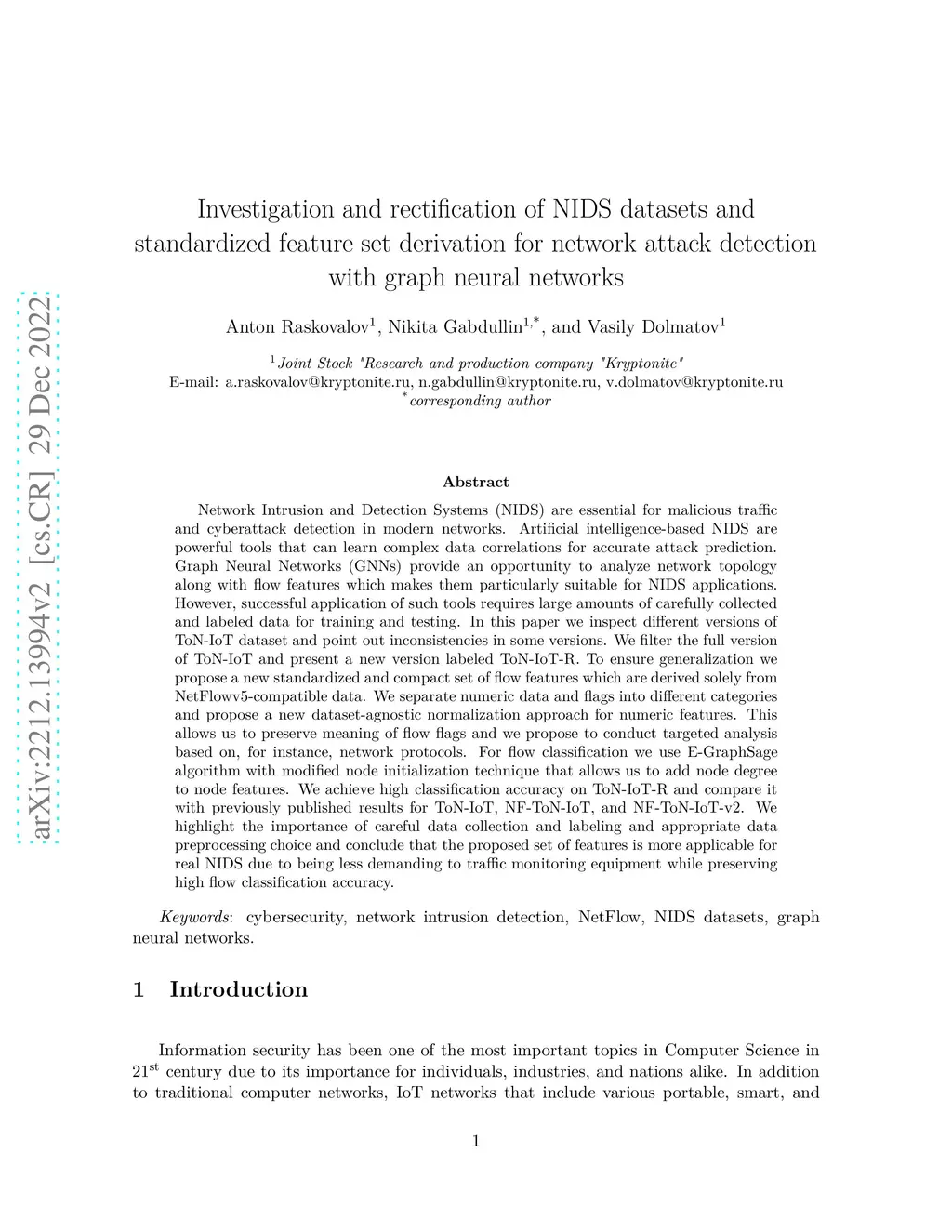 Network Intrusion and Detection Systems (NIDS) are essential for malicious traffic and cyberattack detection in modern networks. Artificial intelligence-based NIDS are powerful tools that can learn complex data correlations for accurate attack prediction. Graph Neural Networks (GNNs) provide an opportunity to analyze network topology along with flow features which makes them particularly suitable for NIDS applications. However, successful application of such tool requires large amounts of carefully collected and labeled data for training and testing. In this paper we inspect different versions of ToN-IoT dataset and point out inconsistencies in some versions. We filter the full version of ToN-IoT and present a new version labeled ToN-IoT-R. To ensure generalization we propose a new standardized and compact set of flow features which are derived solely from NetFlowv5-compatible data. We separate numeric data and flags into different categories and propose a new dataset-agnostic normalization approach for numeric features. This allows us to preserve meaning of flow flags and we propose to conduct targeted analysis based on, for instance, network protocols. For flow classification we use E-GraphSage algorithm with modified node initialization technique that allows us to add node degree to node features. We achieve high classification accuracy on ToN-IoT-R and compare it with previously published results for ToN-IoT, NF-ToN-IoT, and NF-ToN-IoT-v2. We highlight the importance of careful data collection and labeling and appropriate data preprocessing choice and conclude that the proposed set of features is more applicable for real NIDS due to being less demanding to traffic monitoring equipment while preserving high flow classification accuracy.