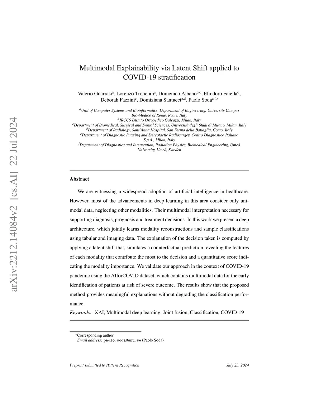 We are witnessing a widespread adoption of artificial intelligence in healthcare. However, most of the advancements in deep learning (DL) in this area consider only unimodal data, neglecting other modalities. Their multimodal interpretation necessary for supporting diagnosis, prognosis and treatment decisions. In this work we present a deep architecture, explainable by design, which jointly learns modality reconstructions and sample classifications using tabular and imaging data. The explanation of the decision taken is computed by applying a latent shift that, simulates a counterfactual prediction revealing the features of each modality that contribute the most to the decision and a quantitative score indicating the modality importance. We validate our approach in the context of COVID-19 pandemic using the AIforCOVID dataset, which contains multimodal data for the early identification of patients at risk of severe outcome. The results show that the proposed method provides meaningful explanations without degrading the classification performance.