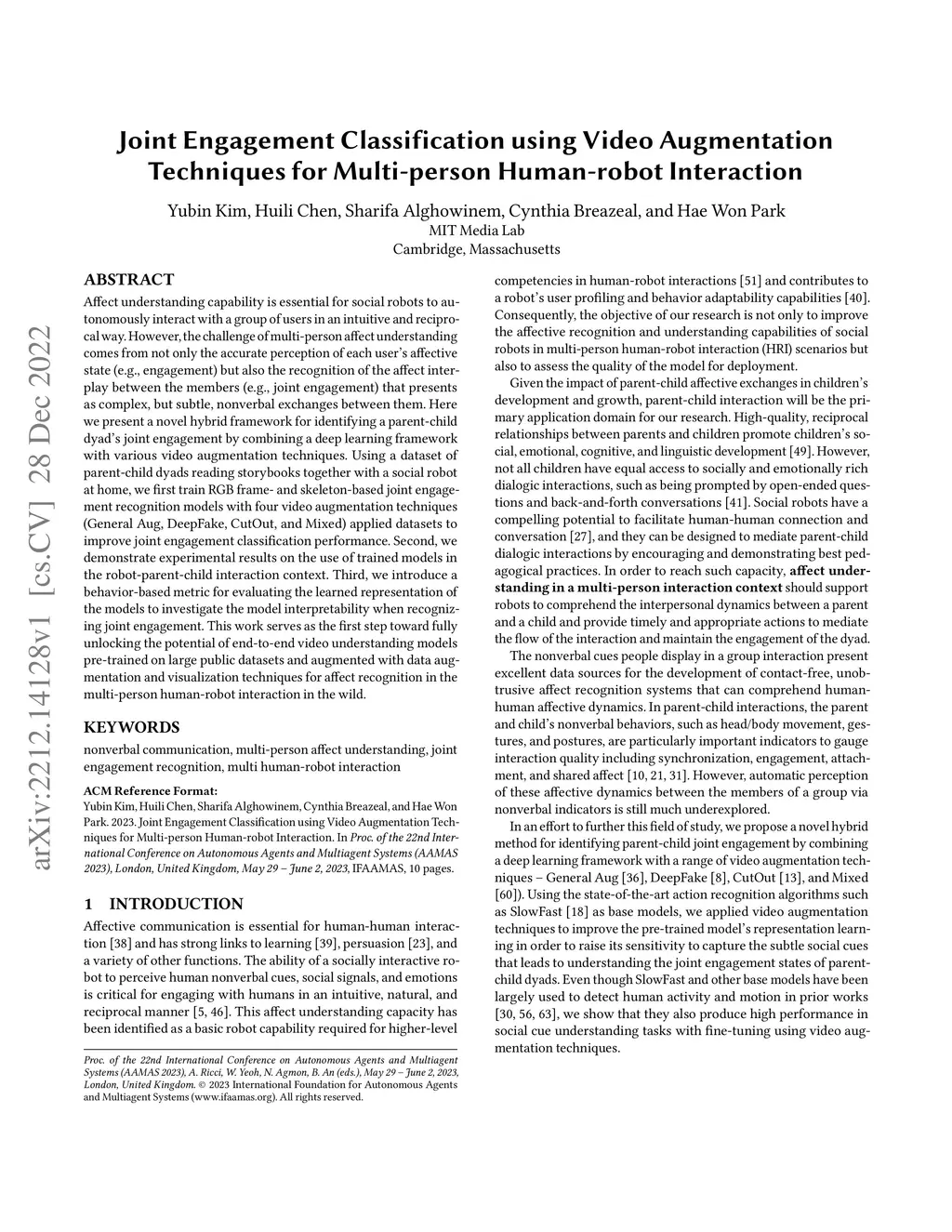 Affect understanding capability is essential for social robots to autonomously interact with a group of users in an intuitive and reciprocal way. However, the challenge of multi-person affect understanding comes from not only the accurate perception of each user's affective state (e.g., engagement) but also the recognition of the affect interplay between the members (e.g., joint engagement) that presents as complex, but subtle, nonverbal exchanges between them. Here we present a novel hybrid framework for identifying a parent-child dyad's joint engagement by combining a deep learning framework with various video augmentation techniques. Using a dataset of parent-child dyads reading storybooks together with a social robot at home, we first train RGB frame- and skeleton-based joint engagement recognition models with four video augmentation techniques (General Aug, DeepFake, CutOut, and Mixed) applied datasets to improve joint engagement classification performance. Second, we demonstrate experimental results on the use of trained models in the robot-parent-child interaction context. Third, we introduce a behavior-based metric for evaluating the learned representation of the models to investigate the model interpretability when recognizing joint engagement. This work serves as the first step toward fully unlocking the potential of end-to-end video understanding models pre-trained on large public datasets and augmented with data augmentation and visualization techniques for affect recognition in the multi-person human-robot interaction in the wild.