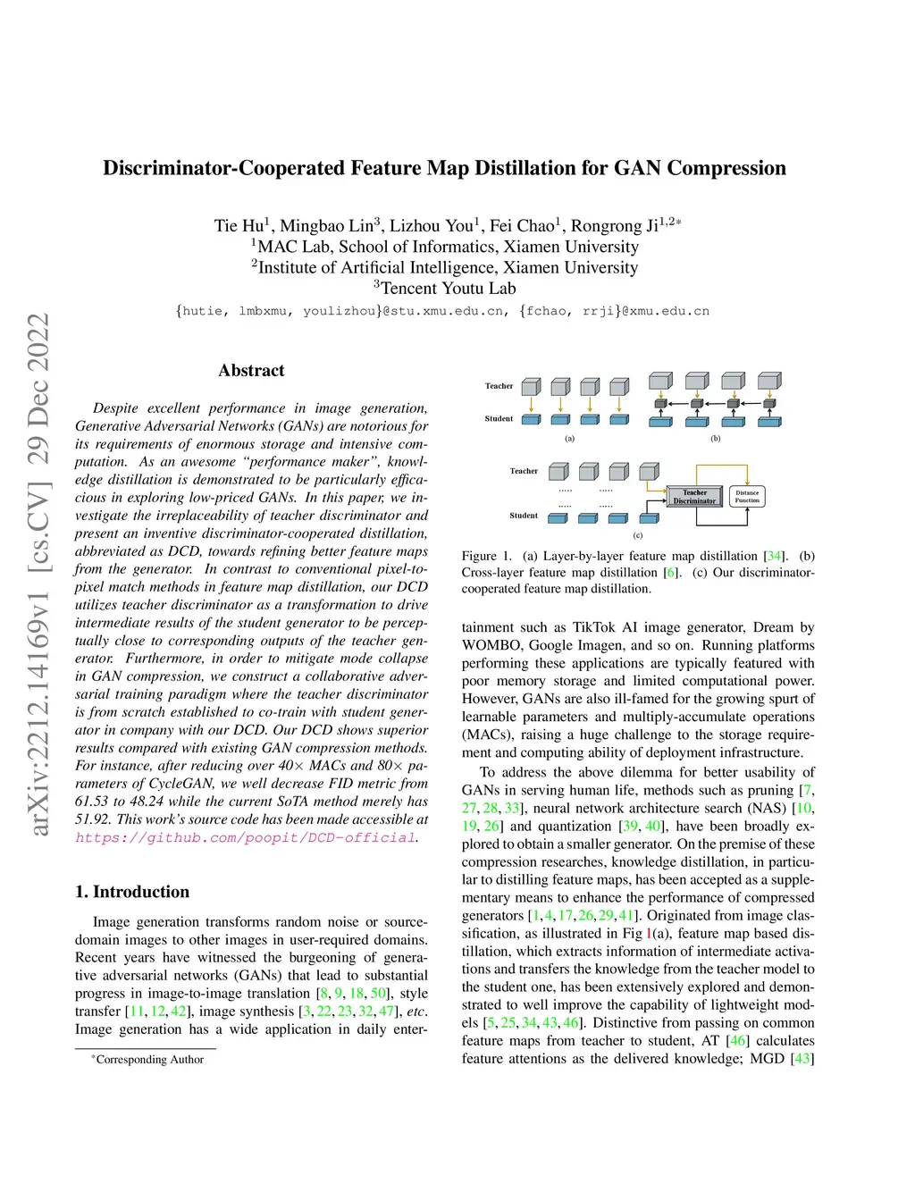 Despite excellent performance in image generation, Generative Adversarial Networks (GANs) are notorious for its requirements of enormous storage and intensive computation. As an awesome ''performance maker'', knowledge distillation is demonstrated to be particularly efficacious in exploring low-priced GANs. In this paper, we investigate the irreplaceability of teacher discriminator and present an inventive discriminator-cooperated distillation, abbreviated as DCD, towards refining better feature maps from the generator. In contrast to conventional pixel-to-pixel match methods in feature map distillation, our DCD utilizes teacher discriminator as a transformation to drive intermediate results of the student generator to be perceptually close to corresponding outputs of the teacher generator. Furthermore, in order to mitigate mode collapse in GAN compression, we construct a collaborative adversarial training paradigm where the teacher discriminator is from scratch established to co-train with student generator in company with our DCD. Our DCD shows superior results compared with existing GAN compression methods. For instance, after reducing over 40x MACs and 80x parameters of CycleGAN, we well decrease FID metric from 61.53 to 48.24 while the current SoTA method merely has 51.92. This work's source code has been made accessible at https://github.com/poopit/DCD-official.