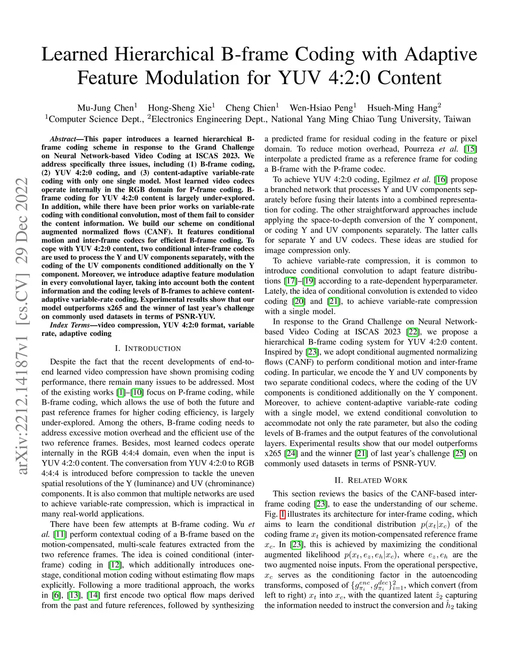 This paper introduces a learned hierarchical B-frame coding scheme in response to the Grand Challenge on Neural Network-based Video Coding at ISCAS 2023. We address specifically three issues, including (1) B-frame coding, (2) YUV 4:2:0 coding, and (3) content-adaptive variable-rate coding with only one single model. Most learned video codecs operate internally in the RGB domain for P-frame coding. B-frame coding for YUV 4:2:0 content is largely under-explored. In addition, while there have been prior works on variable-rate coding with conditional convolution, most of them fail to consider the content information. We build our scheme on conditional augmented normalized flows (CANF). It features conditional motion and inter-frame codecs for efficient B-frame coding. To cope with YUV 4:2:0 content, two conditional inter-frame codecs are used to process the Y and UV components separately, with the coding of the UV components conditioned additionally on the Y component. Moreover, we introduce adaptive feature modulation in every convolutional layer, taking into account both the content information and the coding levels of B-frames to achieve content-adaptive variable-rate coding. Experimental results show that our model outperforms x265 and the winner of last year's challenge on commonly used datasets in terms of PSNR-YUV.