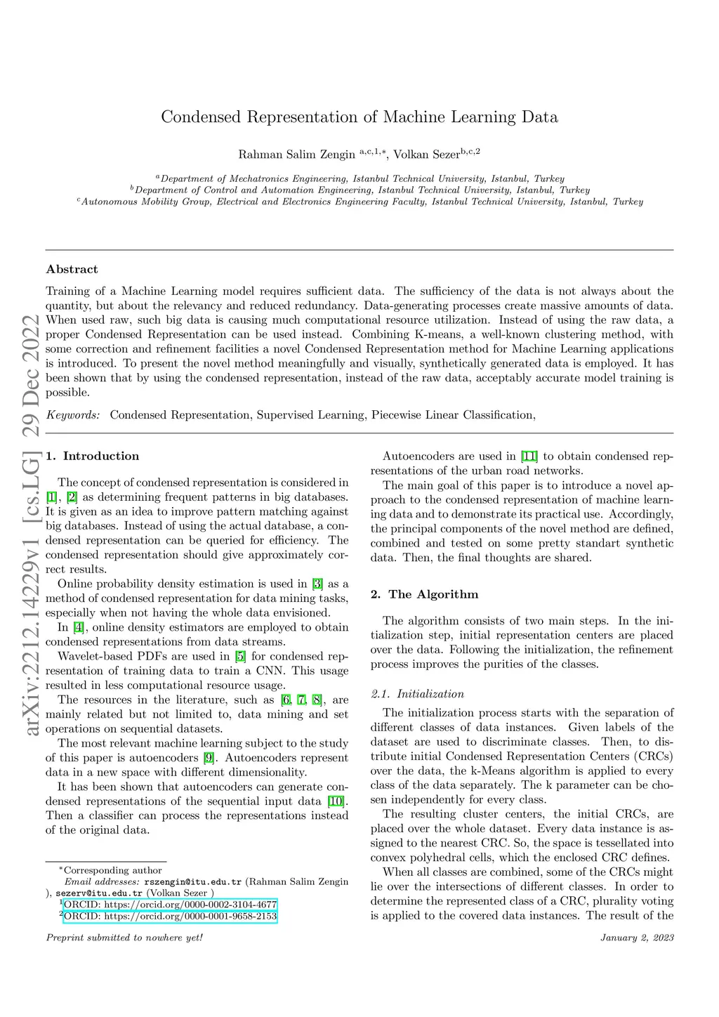 Training of a Machine Learning model requires sufficient data. The sufficiency of the data is not always about the quantity, but about the relevancy and reduced redundancy. Data-generating processes create massive amounts of data. When used raw, such big data is causing much computational resource utilization. Instead of using the raw data, a proper Condensed Representation can be used instead. Combining K-means, a well-known clustering method, with some correction and refinement facilities a novel Condensed Representation method for Machine Learning applications is introduced. To present the novel method meaningfully and visually, synthetically generated data is employed. It has been shown that by using the condensed representation, instead of the raw data, acceptably accurate model training is possible.