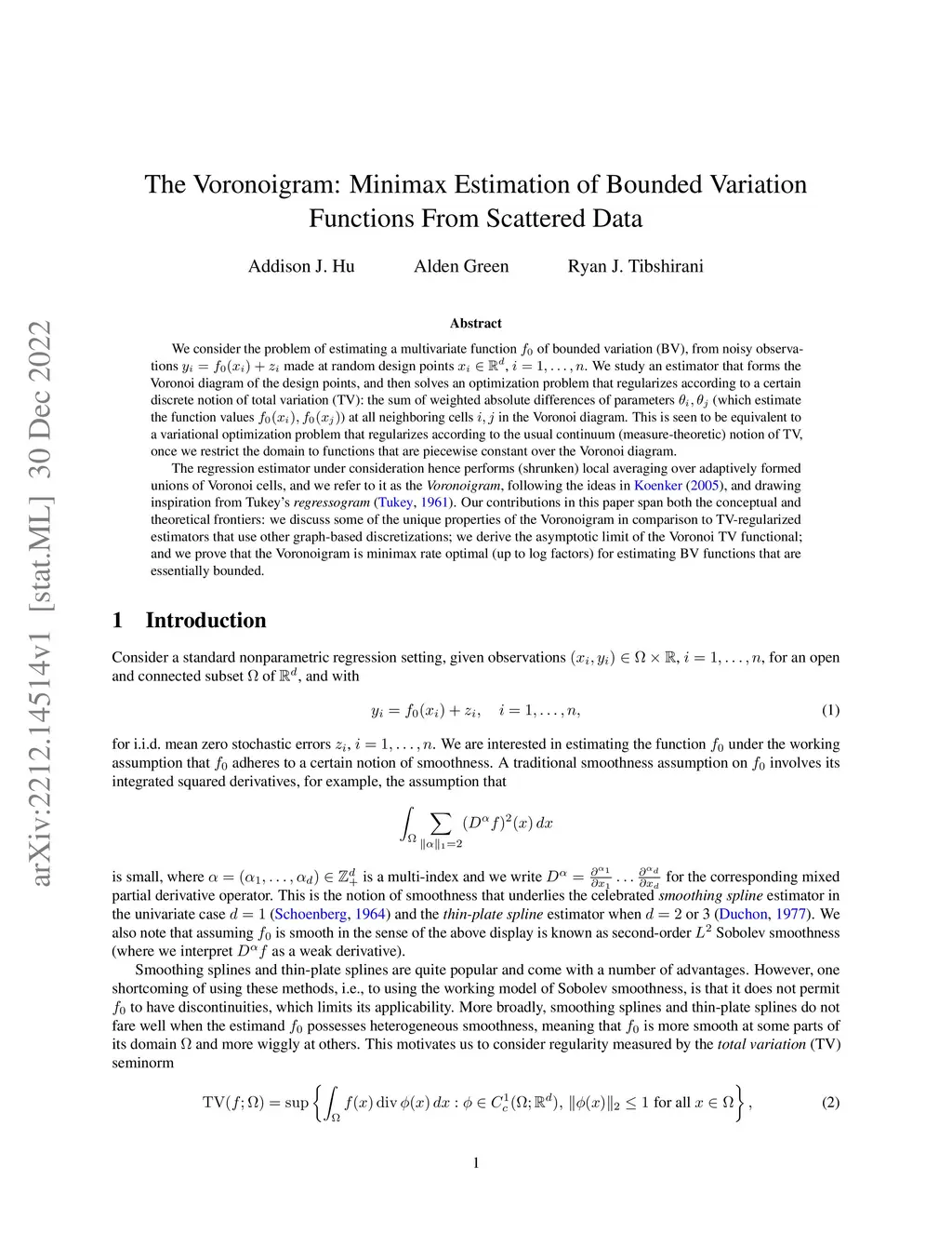 We consider the problem of estimating a multivariate function of bounded variation (BV), from noisy observations made at random design points , . We study an estimator that forms the Voronoi diagram of the design points, and then solves an optimization problem that regularizes according to a certain discrete notion of total variation (TV): the sum of weighted absolute differences of parameters (which estimate the function values ) at all neighboring cells in the Voronoi diagram. This is seen to be equivalent to a variational optimization problem that regularizes according to the usual continuum (measure-theoretic) notion of TV, once we restrict the domain to functions that are piecewise constant over the Voronoi diagram. The regression estimator under consideration hence performs (shrunken) local averaging over adaptively formed unions of Voronoi cells, and we refer to it as the Voronoigram, following the ideas in Koenker (2005), and drawing inspiration from Tukey's regressogram (Tukey, 1961). Our contributions in this paper span both the conceptual and theoretical frontiers: we discuss some of the unique properties of the Voronoigram in comparison to TV-regularized estimators that use other graph-based discretizations; we derive the asymptotic limit of the Voronoi TV functional; and we prove that the Voronoigram is minimax rate optimal (up to log factors) for estimating BV functions that are essentially bounded.