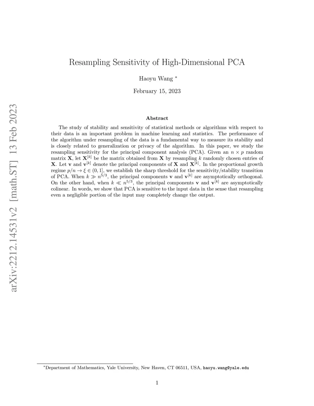 The study of stability and sensitivity of statistical methods or algorithms with respect to their data is an important problem in machine learning and statistics. The performance of the algorithm under resampling of the data is a fundamental way to measure its stability and is closely related to generalization or privacy of the algorithm. In this paper, we study the resampling sensitivity for the principal component analysis (PCA). Given an $ n \times p $ random matrix $ \mathbf{X} $, let $ \mathbf{X}^{[k]} $ be the matrix obtained from $ \mathbf{X} $ by resampling $ k $ randomly chosen entries of $ \mathbf{X} $. Let $ \mathbf{v} $ and $ \mathbf{v}^{[k]} $ denote the principal components of $ \mathbf{X} $ and $ \mathbf{X}^{[k]} $. In the proportional growth regime $ p/n \to \xi \in (0,1] $, we establish the sharp threshold for the sensitivity/stability transition of PCA. When $ k \gg n^{5/3} $, the principal components $ \mathbf{v} $ and $ \mathbf{v}^{[k]} $ are asymptotically orthogonal. On the other hand, when $ k \ll n^{5/3} $, the principal components $ \mathbf{v} $ and $ \mathbf{v}^{[k]} $ are asymptotically colinear. In words, we show that PCA is sensitive to the input data in the sense that resampling even a negligible portion of the input may completely change the output.