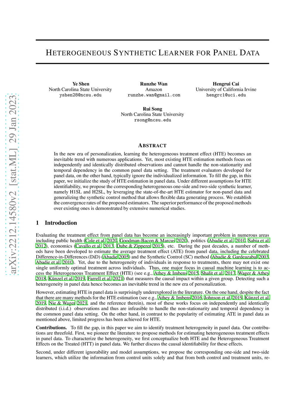 In the new era of personalization, learning the heterogeneous treatment effect (HTE) becomes an inevitable trend with numerous applications. Yet, most existing HTE estimation methods focus on independently and identically distributed observations and cannot handle the non-stationarity and temporal dependency in the common panel data setting. The treatment evaluators developed for panel data, on the other hand, typically ignore the individualized information. To fill the gap, in this paper, we initialize the study of HTE estimation in panel data. Under different assumptions for HTE identifiability, we propose the corresponding heterogeneous one-side and two-side synthetic learner, namely H1SL and H2SL, by leveraging the state-of-the-art HTE estimator for non-panel data and generalizing the synthetic control method that allows flexible data generating process. We establish the convergence rates of the proposed estimators. The superior performance of the proposed methods over existing ones is demonstrated by extensive numerical studies.