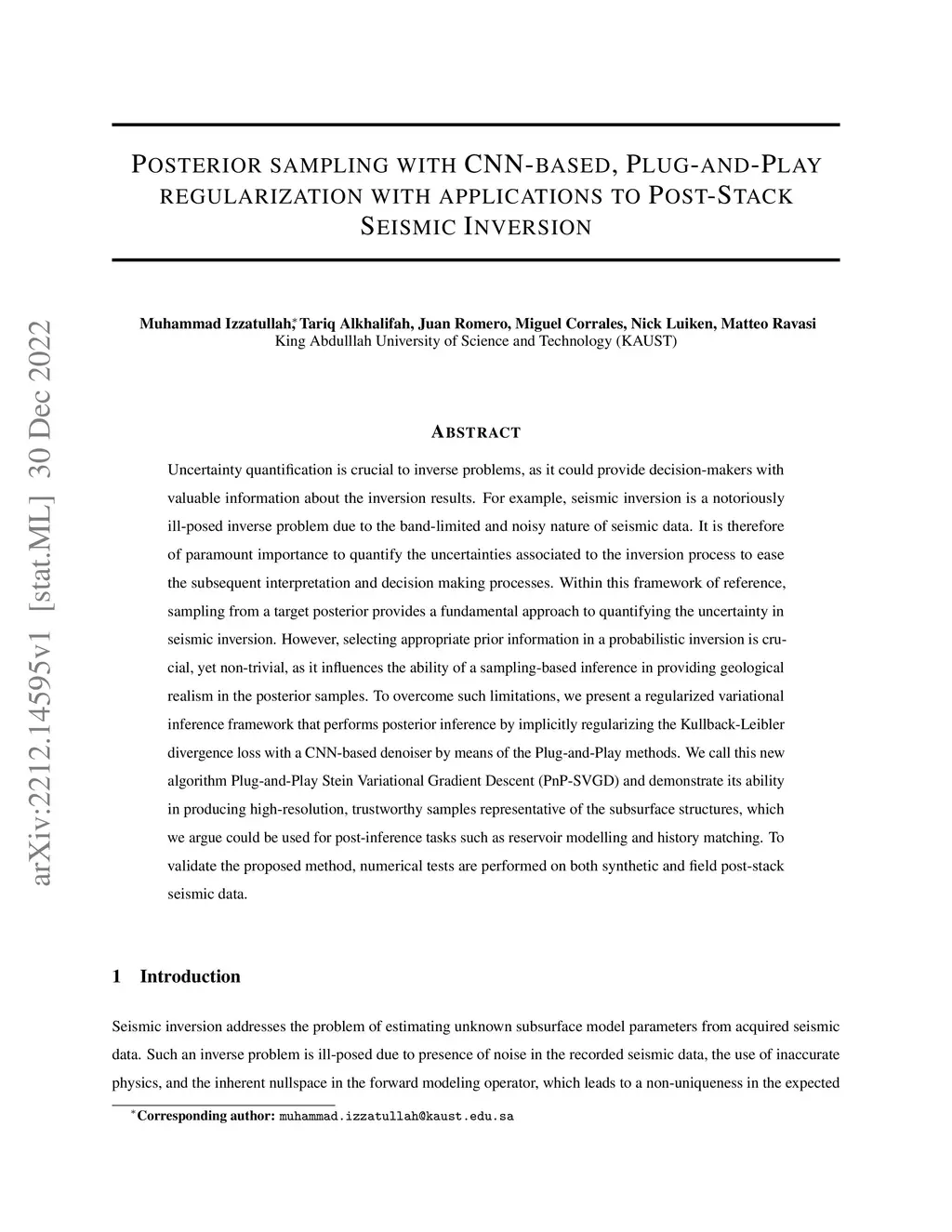 Uncertainty quantification is crucial to inverse problems, as it could provide decision-makers with valuable information about the inversion results. For example, seismic inversion is a notoriously ill-posed inverse problem due to the band-limited and noisy nature of seismic data. It is therefore of paramount importance to quantify the uncertainties associated to the inversion process to ease the subsequent interpretation and decision making processes. Within this framework of reference, sampling from a target posterior provides a fundamental approach to quantifying the uncertainty in seismic inversion. However, selecting appropriate prior information in a probabilistic inversion is crucial, yet non-trivial, as it influences the ability of a sampling-based inference in providing geological realism in the posterior samples. To overcome such limitations, we present a regularized variational inference framework that performs posterior inference by implicitly regularizing the Kullback-Leibler divergence loss with a CNN-based denoiser by means of the Plug-and-Play methods. We call this new algorithm Plug-and-Play Stein Variational Gradient Descent (PnP-SVGD) and demonstrate its ability in producing high-resolution, trustworthy samples representative of the subsurface structures, which we argue could be used for post-inference tasks such as reservoir modelling and history matching. To validate the proposed method, numerical tests are performed on both synthetic and field post-stack seismic data.