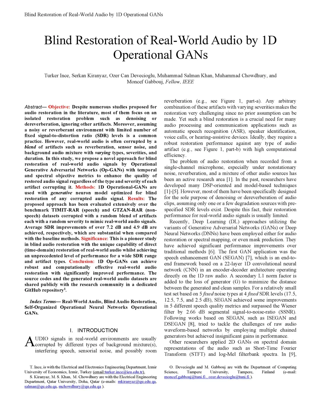 Blind Restoration of Real-World Audio by 1D Operational GANs