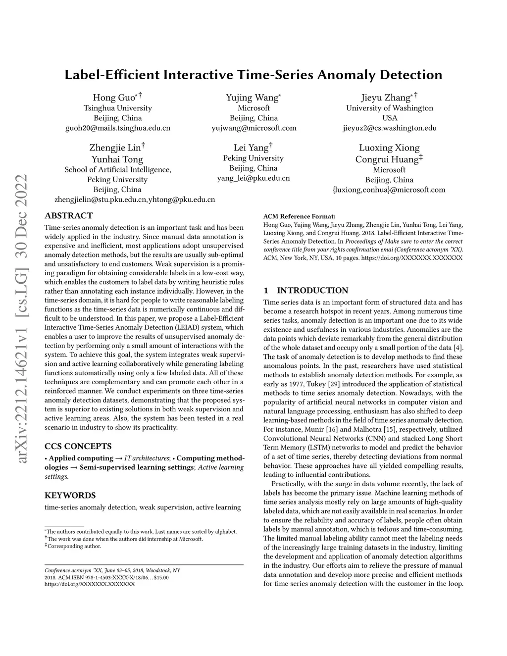 Time-series anomaly detection is an important task and has been widely applied in the industry. Since manual data annotation is expensive and inefficient, most applications adopt unsupervised anomaly detection methods, but the results are usually sub-optimal and unsatisfactory to end customers. Weak supervision is a promising paradigm for obtaining considerable labels in a low-cost way, which enables the customers to label data by writing heuristic rules rather than annotating each instance individually. However, in the time-series domain, it is hard for people to write reasonable labeling functions as the time-series data is numerically continuous and difficult to be understood. In this paper, we propose a Label-Efficient Interactive Time-Series Anomaly Detection (LEIAD) system, which enables a user to improve the results of unsupervised anomaly detection by performing only a small amount of interactions with the system. To achieve this goal, the system integrates weak supervision and active learning collaboratively while generating labeling functions automatically using only a few labeled data. All of these techniques are complementary and can promote each other in a reinforced manner. We conduct experiments on three time-series anomaly detection datasets, demonstrating that the proposed system is superior to existing solutions in both weak supervision and active learning areas. Also, the system has been tested in a real scenario in industry to show its practicality.