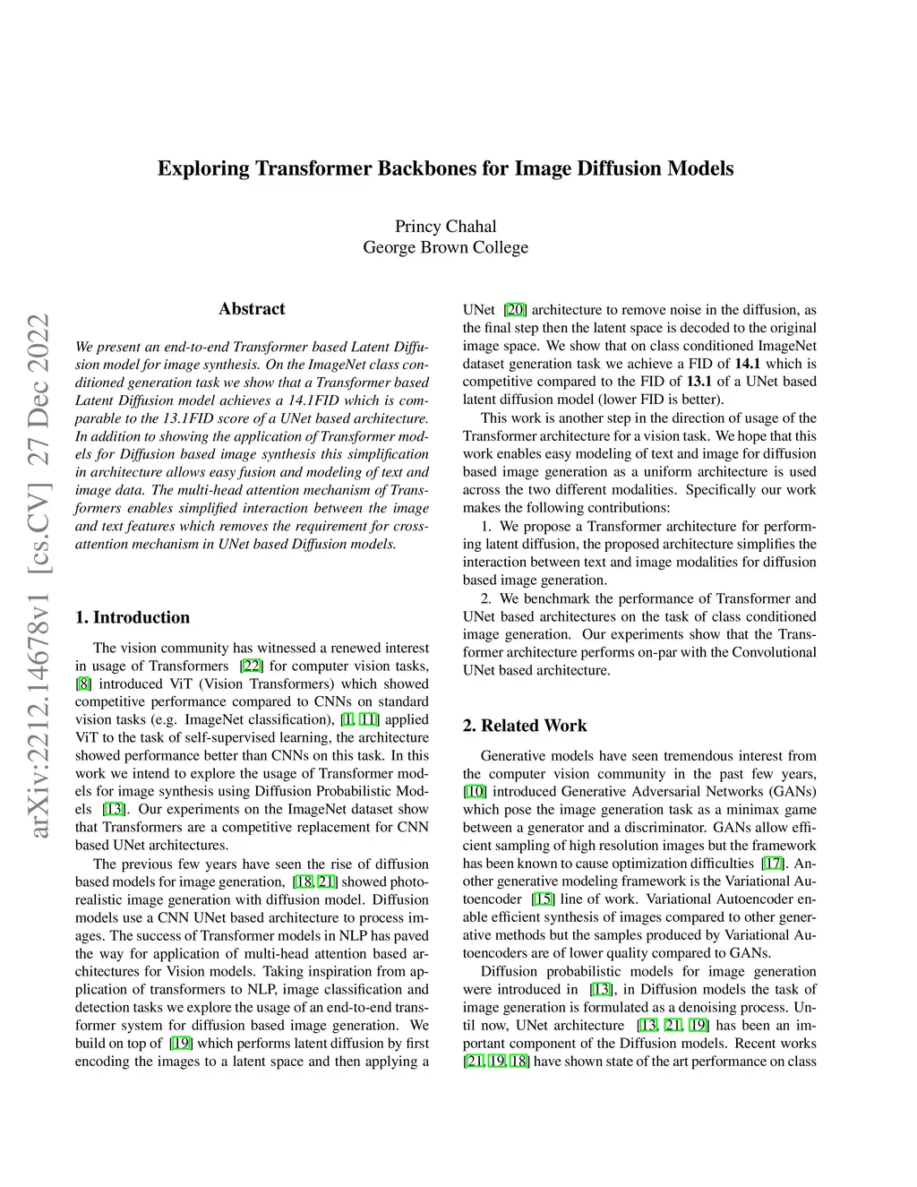 We present an end-to-end Transformer based Latent Diffusion model for image synthesis. On the ImageNet class conditioned generation task we show that a Transformer based Latent Diffusion model achieves a 14.1FID which is comparable to the 13.1FID score of a UNet based architecture. In addition to showing the application of Transformer models for Diffusion based image synthesis this simplification in architecture allows easy fusion and modeling of text and image data. The multi-head attention mechanism of Transformers enables simplified interaction between the image and text features which removes the requirement for crossattention mechanism in UNet based Diffusion models.
