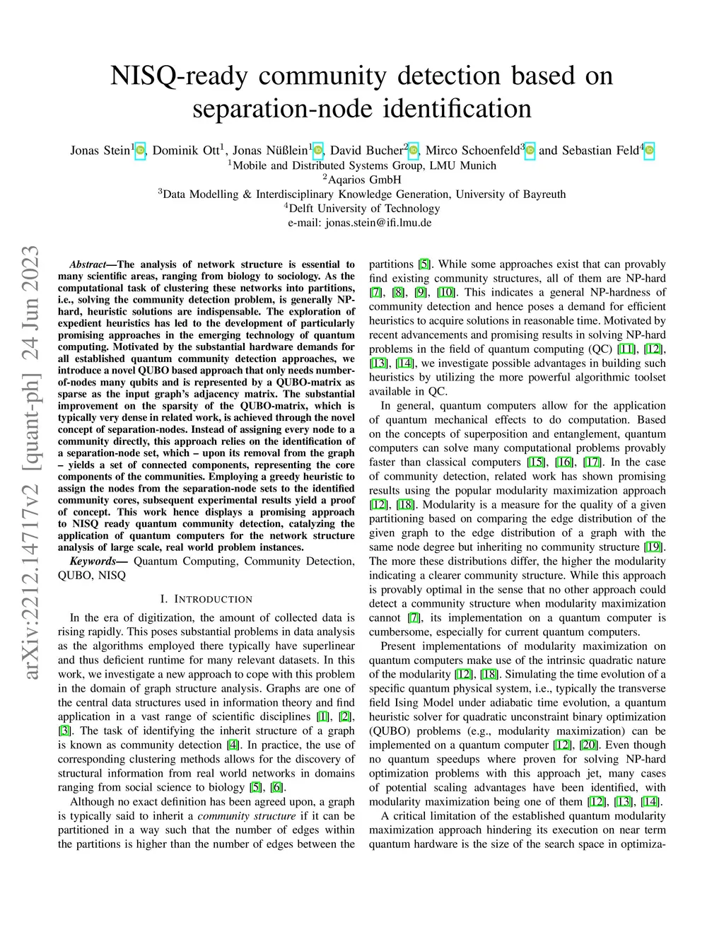 The analysis of network structure is essential to many scientific areas, ranging from biology to sociology. As the computational task of clustering these networks into partitions, i.e., solving the community detection problem, is generally NP-hard, heuristic solutions are indispensable. The exploration of expedient heuristics has led to the development of particularly promising approaches in the emerging technology of quantum computing. Motivated by the substantial hardware demands for all established quantum community detection approaches, we introduce a novel QUBO based approach that only needs number-of-nodes many qubits and is represented by a QUBO-matrix as sparse as the input graph's adjacency matrix. The substantial improvement on the sparsity of the QUBO-matrix, which is typically very dense in related work, is achieved through the novel concept of separation-nodes. Instead of assigning every node to a community directly, this approach relies on the identification of a separation-node set, which -- upon its removal from the graph -- yields a set of connected components, representing the core components of the communities. Employing a greedy heuristic to assign the nodes from the separation-node sets to the identified community cores, subsequent experimental results yield a proof of concept. This work hence displays a promising approach to NISQ ready quantum community detection, catalyzing the application of quantum computers for the network structure analysis of large scale, real world problem instances.