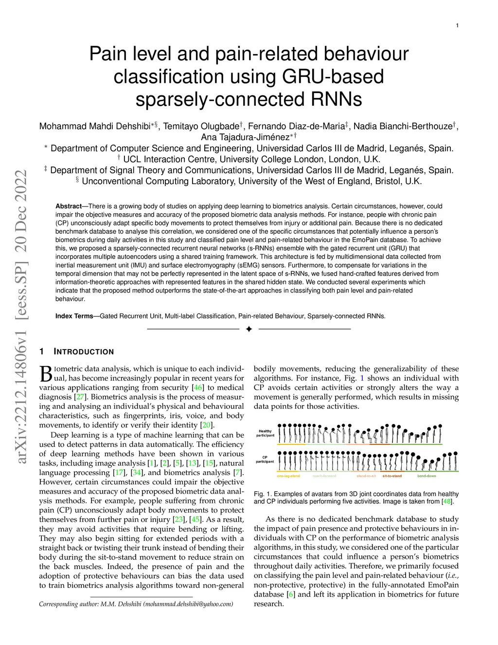 There is a growing body of studies on applying deep learning to biometrics analysis. Certain circumstances, however, could impair the objective measures and accuracy of the proposed biometric data analysis methods. For instance, people with chronic pain (CP) unconsciously adapt specific body movements to protect themselves from injury or additional pain. Because there is no dedicated benchmark database to analyse this correlation, we considered one of the specific circumstances that potentially influence a person's biometrics during daily activities in this study and classified pain level and pain-related behaviour in the EmoPain database. To achieve this, we proposed a sparsely-connected recurrent neural networks (s-RNNs) ensemble with the gated recurrent unit (GRU) that incorporates multiple autoencoders using a shared training framework. This architecture is fed by multidimensional data collected from inertial measurement unit (IMU) and surface electromyography (sEMG) sensors. Furthermore, to compensate for variations in the temporal dimension that may not be perfectly represented in the latent space of s-RNNs, we fused hand-crafted features derived from information-theoretic approaches with represented features in the shared hidden state. We conducted several experiments which indicate that the proposed method outperforms the state-of-the-art approaches in classifying both pain level and pain-related behaviour.