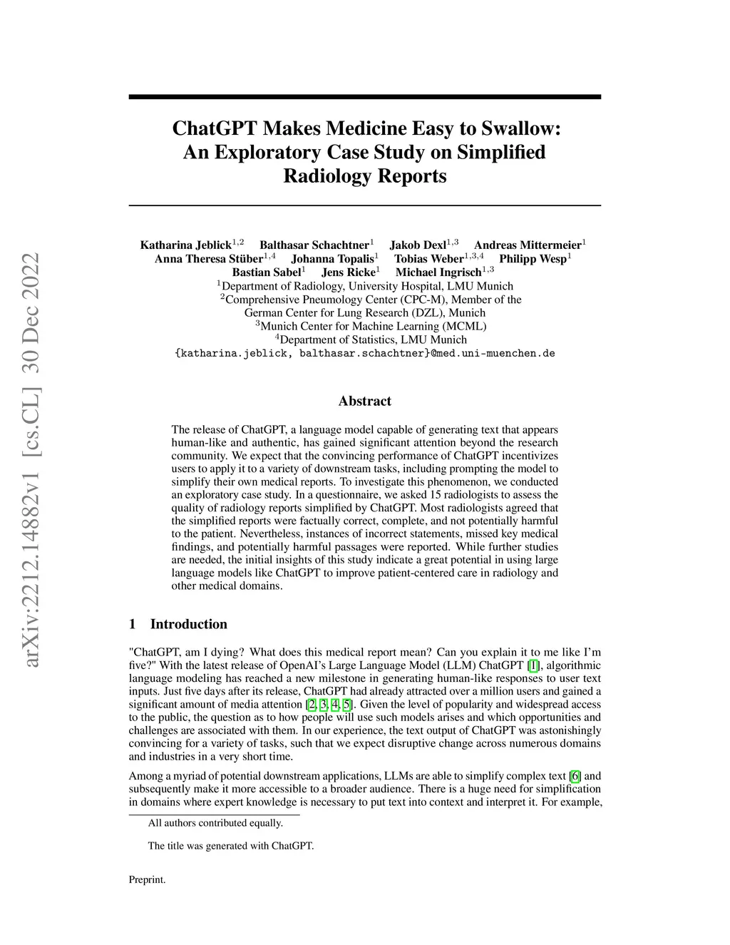 The release of ChatGPT, a language model capable of generating text that appears human-like and authentic, has gained significant attention beyond the research community. We expect that the convincing performance of ChatGPT incentivizes users to apply it to a variety of downstream tasks, including prompting the model to simplify their own medical reports. To investigate this phenomenon, we conducted an exploratory case study. In a questionnaire, we asked 15 radiologists to assess the quality of radiology reports simplified by ChatGPT. Most radiologists agreed that the simplified reports were factually correct, complete, and not potentially harmful to the patient. Nevertheless, instances of incorrect statements, missed key medical findings, and potentially harmful passages were reported. While further studies are needed, the initial insights of this study indicate a great potential in using large language models like ChatGPT to improve patient-centered care in radiology and other medical domains.