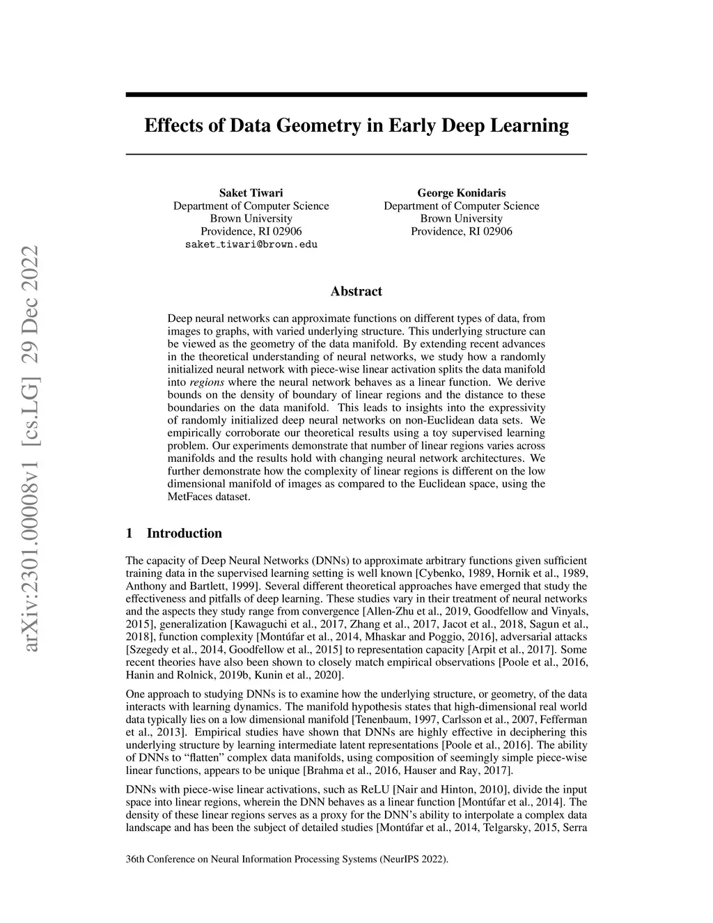 Deep neural networks can approximate functions on different types of data, from images to graphs, with varied underlying structure. This underlying structure can be viewed as the geometry of the data manifold. By extending recent advances in the theoretical understanding of neural networks, we study how a randomly initialized neural network with piece-wise linear activation splits the data manifold into regions where the neural network behaves as a linear function. We derive bounds on the density of boundary of linear regions and the distance to these boundaries on the data manifold. This leads to insights into the expressivity of randomly initialized deep neural networks on non-Euclidean data sets. We empirically corroborate our theoretical results using a toy supervised learning problem. Our experiments demonstrate that number of linear regions varies across manifolds and the results hold with changing neural network architectures. We further demonstrate how the complexity of linear regions is different on the low dimensional manifold of images as compared to the Euclidean space, using the MetFaces dataset.