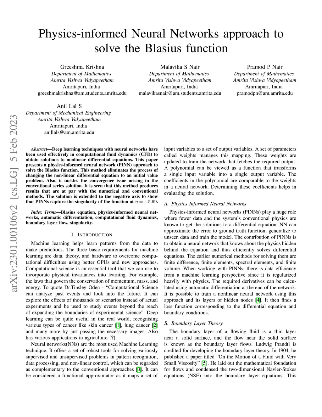 Deep learning techniques with neural networks have been used effectively in computational fluid dynamics (CFD) to obtain solutions to nonlinear differential equations. This paper presents a physics-informed neural network (PINN) approach to solve the Blasius function. This method eliminates the process of changing the non-linear differential equation to an initial value problem. Also, it tackles the convergence issue arising in the conventional series solution. It is seen that this method produces results that are at par with the numerical and conventional methods. The solution is extended to the negative axis to show that PINNs capture the singularity of the function at