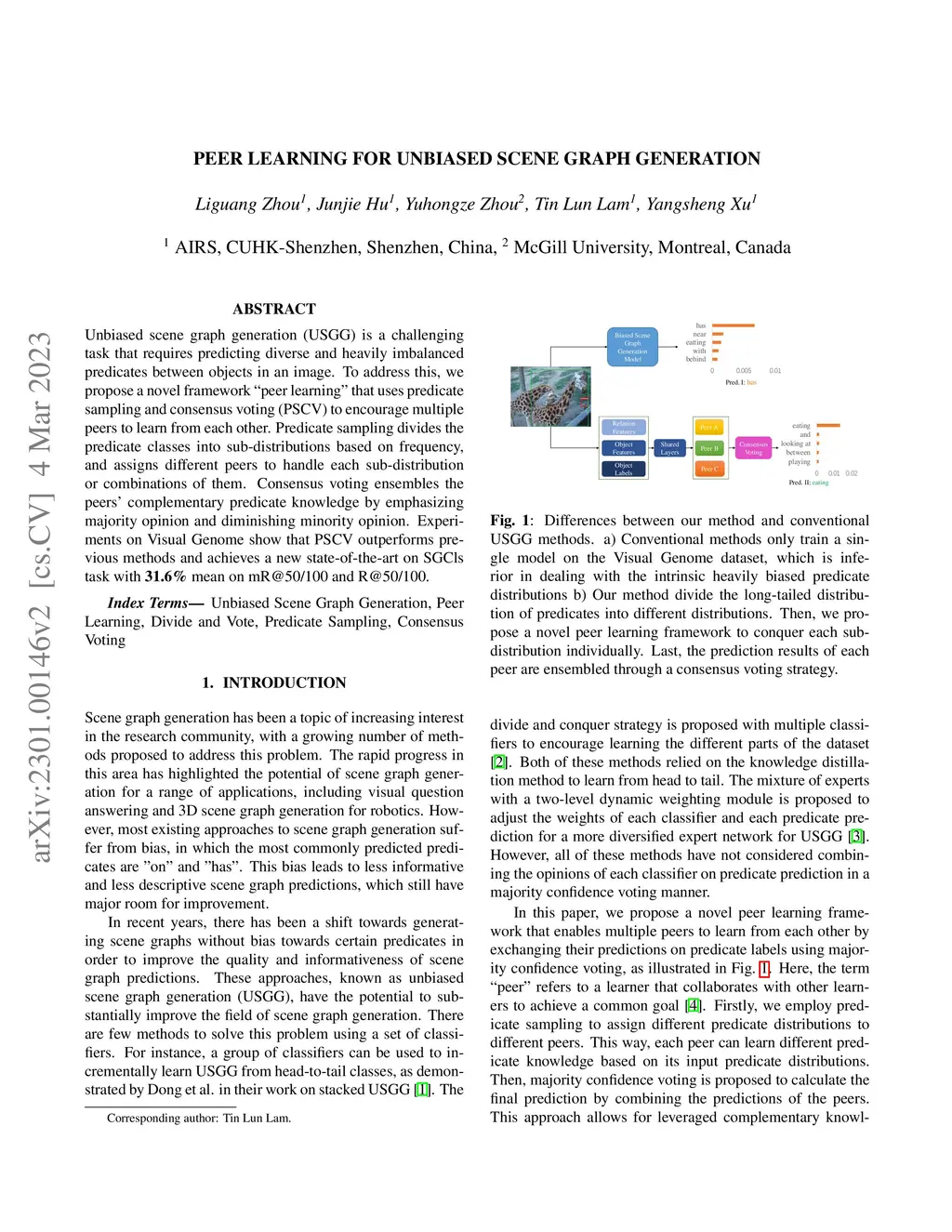 Unbiased scene graph generation (USGG) is a challenging task that requires predicting diverse and heavily imbalanced predicates between objects in an image. To address this, we propose a novel framework peer learning that uses predicate sampling and consensus voting (PSCV) to encourage multiple peers to learn from each other. Predicate sampling divides the predicate classes into sub-distributions based on frequency, and assigns different peers to handle each sub-distribution or combinations of them. Consensus voting ensembles the peers' complementary predicate knowledge by emphasizing majority opinion and diminishing minority opinion. Experiments on Visual Genome show that PSCV outperforms previous methods and achieves a new state-of-the-art on SGCls task with 31.6 mean.