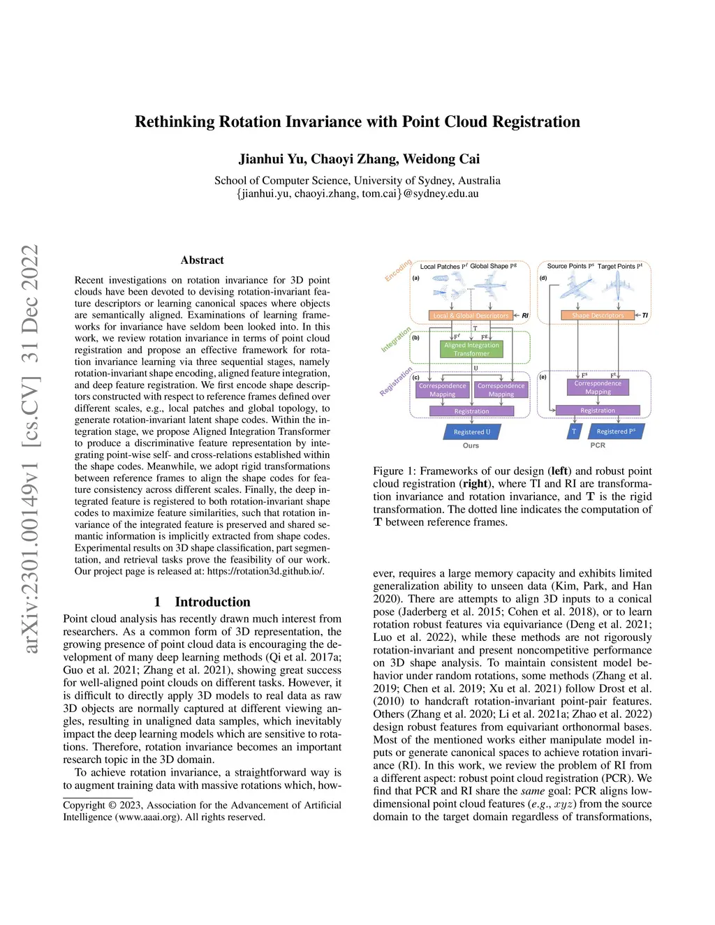 Recent investigations on rotation invariance for 3D point clouds have been devoted to devising rotation-invariant feature descriptors or learning canonical spaces where objects are semantically aligned. Examinations of learning frameworks for invariance have seldom been looked into. In this work, we review rotation invariance in terms of point cloud registration and propose an effective framework for rotation invariance learning via three sequential stages, namely rotation-invariant shape encoding, aligned feature integration, and deep feature registration. We first encode shape descriptors constructed with respect to reference frames defined over different scales, e.g., local patches and global topology, to generate rotation-invariant latent shape codes. Within the integration stage, we propose Aligned Integration Transformer to produce a discriminative feature representation by integrating point-wise self- and cross-relations established within the shape codes. Meanwhile, we adopt rigid transformations between reference frames to align the shape codes for feature consistency across different scales. Finally, the deep integrated feature is registered to both rotation-invariant shape codes to maximize feature similarities, such that rotation invariance of the integrated feature is preserved and shared semantic information is implicitly extracted from shape codes. Experimental results on 3D shape classification, part segmentation, and retrieval tasks prove the feasibility of our work. Our project page is released at: https://rotation3d.github.io/.