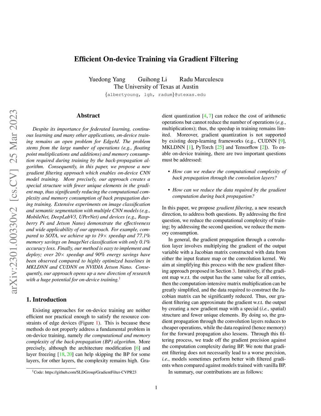 Despite its importance for federated learning, continuous learning and many other applications, on-device training remains an open problem for EdgeAI. The problem stems from the large number of operations (e.g., floating point multiplications and additions) and memory consumption required during training by the back-propagation algorithm. Consequently, in this paper, we propose a new gradient filtering approach which enables on-device CNN model training. More precisely, our approach creates a special structure with fewer unique elements in the gradient map, thus significantly reducing the computational complexity and memory consumption of back propagation during training. Extensive experiments on image classification and semantic segmentation with multiple CNN models (e.g., MobileNet, DeepLabV3, UPerNet) and devices (e.g., Raspberry Pi and Jetson Nano) demonstrate the effectiveness and wide applicability of our approach. For example, compared to SOTA, we achieve up to 19 speedup and 77.1% memory savings on ImageNet classification with only 0.1% accuracy loss. Finally, our method is easy to implement and deploy; over 20 speedup and 90% energy savings have been observed compared to highly optimized baselines in MKLDNN and CUDNN on NVIDIA Jetson Nano. Consequently, our approach opens up a new direction of research with a huge potential for on-device training.