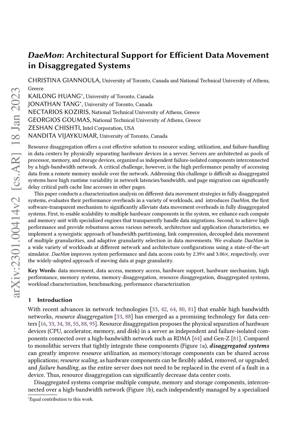 Resource disaggregation offers a cost effective solution to resource scaling, utilization, and failure-handling in data centers by physically separating hardware devices in a server. Servers are architected as pools of processor, memory, and storage devices, organized as independent failure-isolated components interconnected by a high-bandwidth network. A critical challenge, however, is the high performance penalty of accessing data from a remote memory module over the network. Addressing this challenge is difficult as disaggregated systems have high runtime variability in network latencies/bandwidth, and page migration can significantly delay critical path cache line accesses in other pages. This paper conducts a characterization analysis on different data movement strategies in fully disaggregated systems, evaluates their performance overheads in a variety of workloads, and introduces DaeMon, the first software-transparent mechanism to significantly alleviate data movement overheads in fully disaggregated systems. First, to enable scalability to multiple hardware components in the system, we enhance each compute and memory unit with specialized engines that transparently handle data migrations. Second, to achieve high performance and provide robustness across various network, architecture and application characteristics, we implement a synergistic approach of bandwidth partitioning, link compression, decoupled data movement of multiple granularities, and adaptive granularity selection in data movements. We evaluate DaeMon in a wide variety of workloads at different network and architecture configurations using a state-of-the-art accurate simulator. DaeMon improves system performance and data access costs by 2.39 and 3.06, respectively, over the widely-adopted approach of moving data at page granularity.