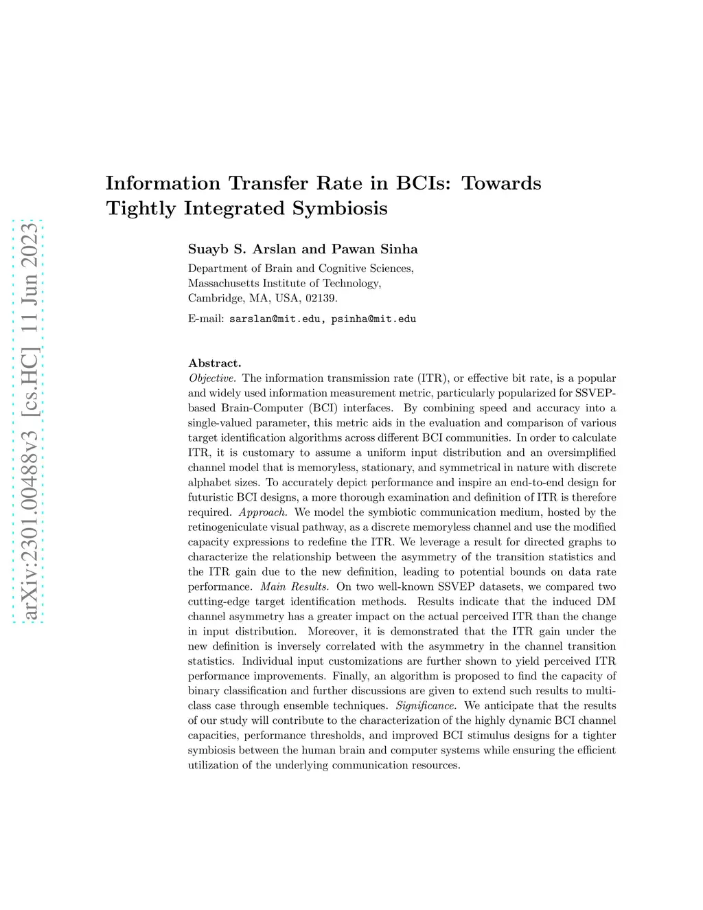 The information transmission rate (ITR), or effective bit rate, is a popular and widely used information measurement metric, particularly popularized for SSVEP-based Brain-Computer (BCI) interfaces. By combining speed and accuracy into a single-valued parameter, this metric aids in the evaluation and comparison of various target identification algorithms across different BCI communities. In order to calculate ITR, it is customary to assume a uniform input distribution and an oversimplified channel model that is memoryless, stationary, and symmetrical in nature with discrete alphabet sizes. To accurately depict performance and inspire an end-to-end design for futuristic BCI designs, a more thorough examination and definition of ITR is therefore required. We model the symbiotic communication medium, hosted by the retinogeniculate visual pathway, as a discrete memoryless channel and use the modified capacity expressions to redefine the ITR. We leverage a result for directed graphs to characterize the relationship between the asymmetry of the transition statistics and the ITR gain due to the new definition, leading to potential bounds on data rate performance. On two well-known SSVEP datasets, we compared two cutting-edge target identification methods. Results indicate that the induced DM channel asymmetry has a greater impact on the actual perceived ITR than the change in input distribution. Moreover, it is demonstrated that the ITR gain under the new definition is inversely correlated with the asymmetry in the channel transition statistics. Individual input customizations are further shown to yield perceived ITR performance improvements. Finally, an algorithm is proposed to find the capacity of binary classification and further discussions are given to extend such results to multi-class case through ensemble techniques.