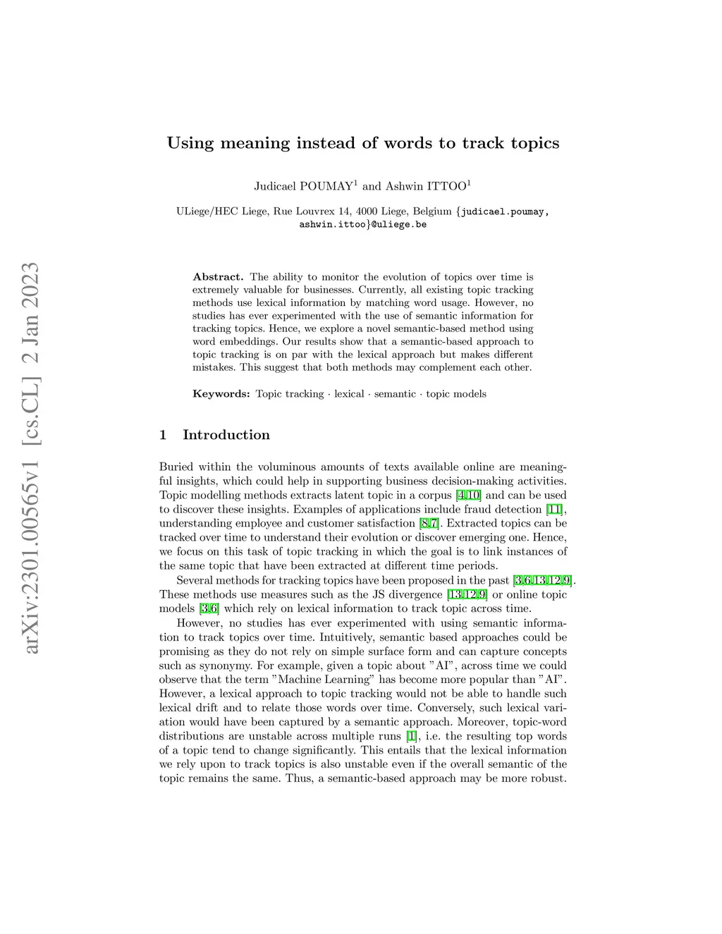 The ability to monitor the evolution of topics over time is extremely valuable for businesses. Currently, all existing topic tracking methods use lexical information by matching word usage. However, no studies has ever experimented with the use of semantic information for tracking topics. Hence, we explore a novel semantic-based method using word embeddings. Our results show that a semantic-based approach to topic tracking is on par with the lexical approach but makes different mistakes. This suggest that both methods may complement each other.